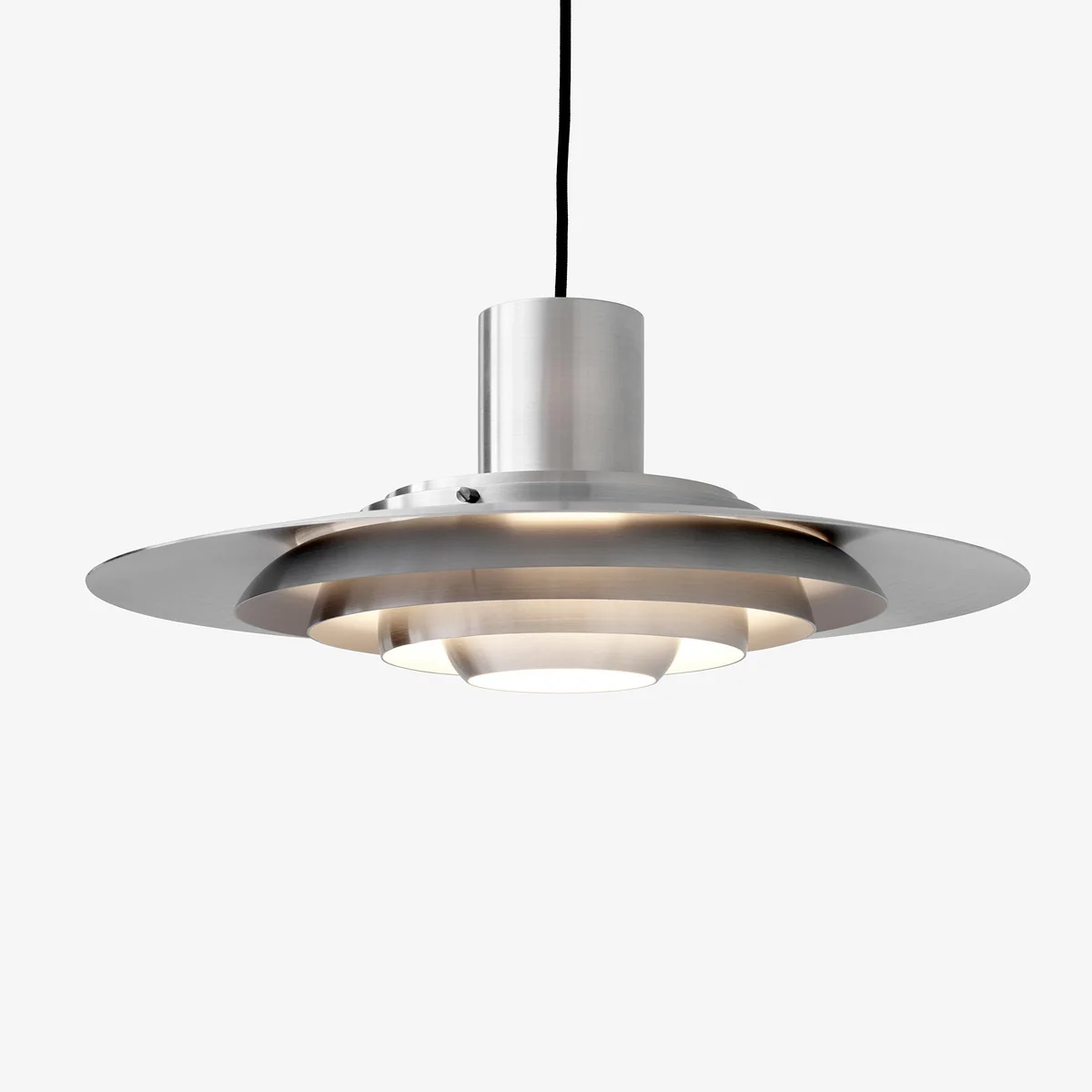 Le luminaire suspendu P376 est disponible en aluminium brossé ou peint en différentes tailles.