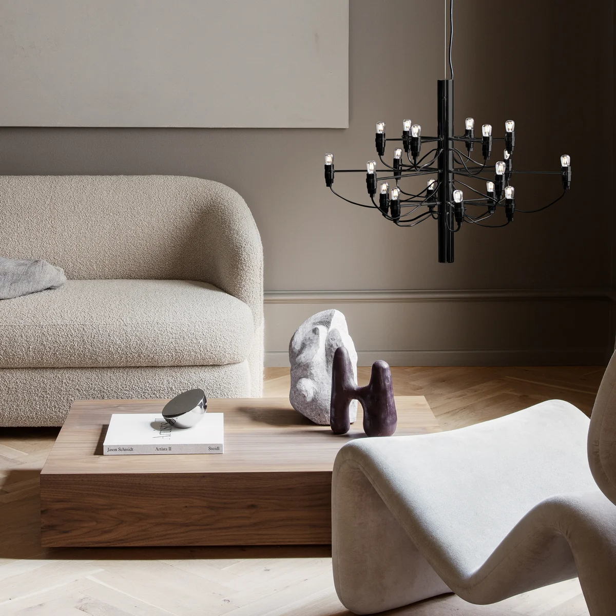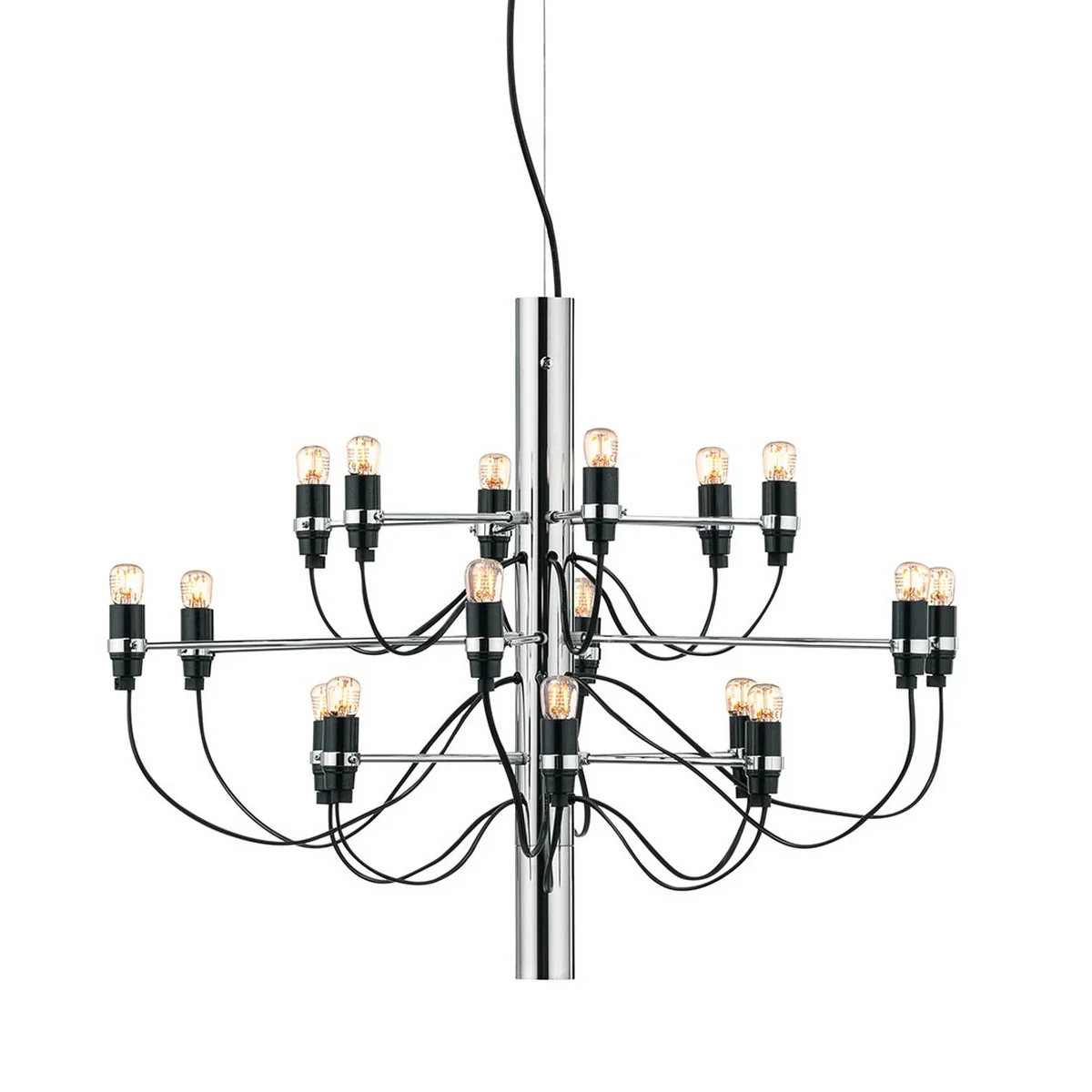 Le lustre 2097 a été conçu dès 1958 par Gino Sarfatti et est une interprétation moderne du lustre classique. Un tube d'acier au centre cache les câbles d'alimentation partant des ampoules, ce qui donne un design plein d'élan et pourtant sobre.