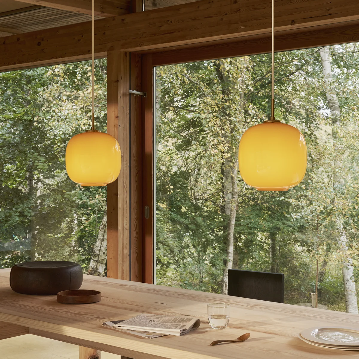 Le luminaire VL45 diffuse une lumière douce et uniforme grâce aux multiples couches de verre. L'ouverture à la base permet - selon la hauteur de suspension - de diriger la lumière de manière concentrée vers le bas. Selon la qualité de lumière souhaitée, le luminaire peut donc être installé en hauteur - pour un éclairage uniforme - ou en position basse - pour un éclairage concentré.