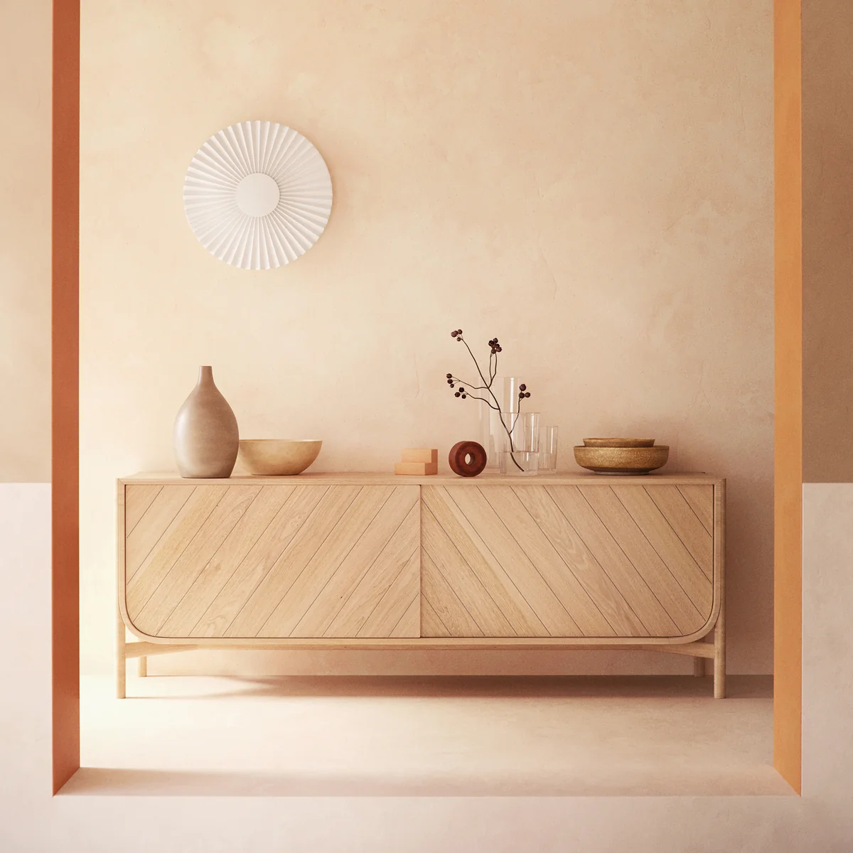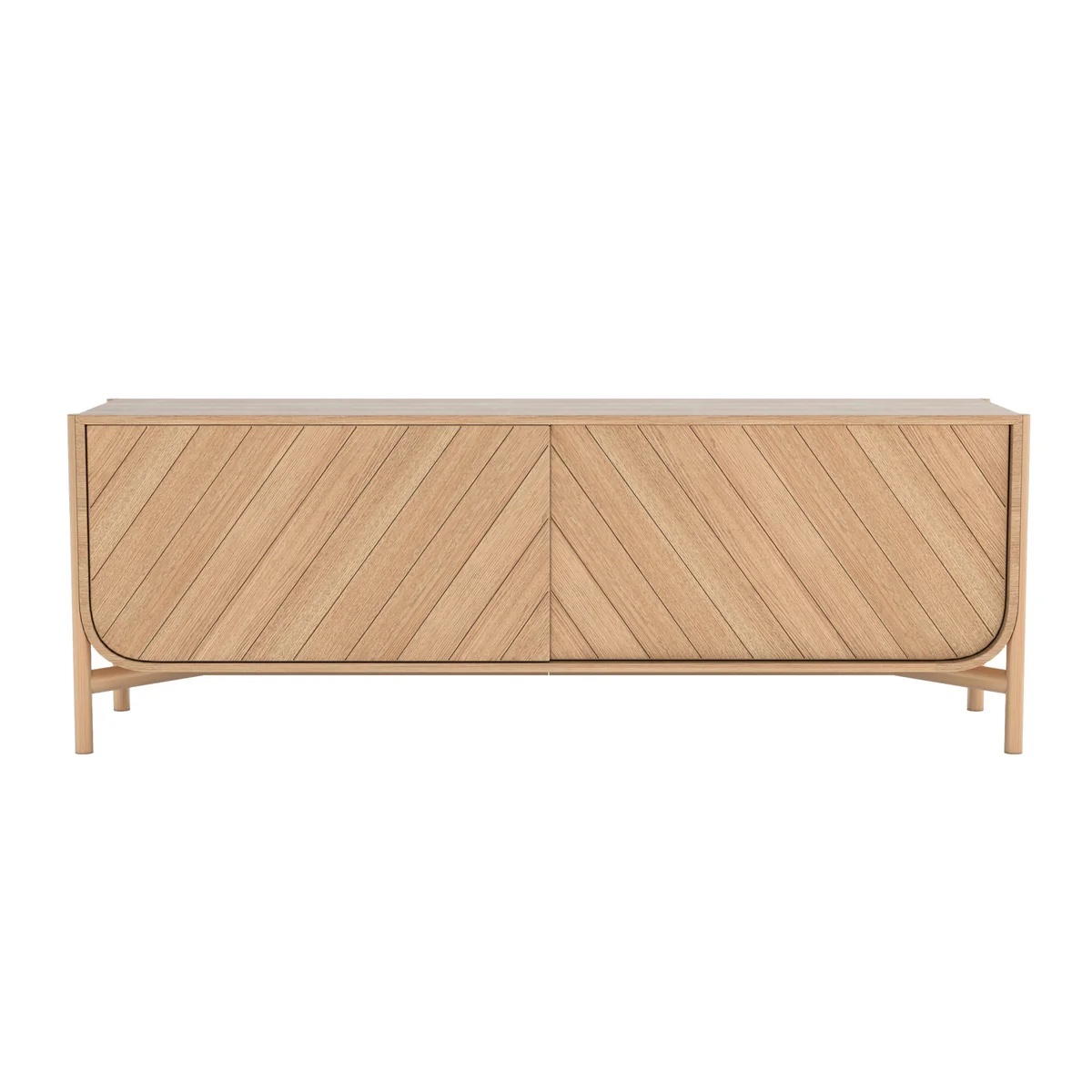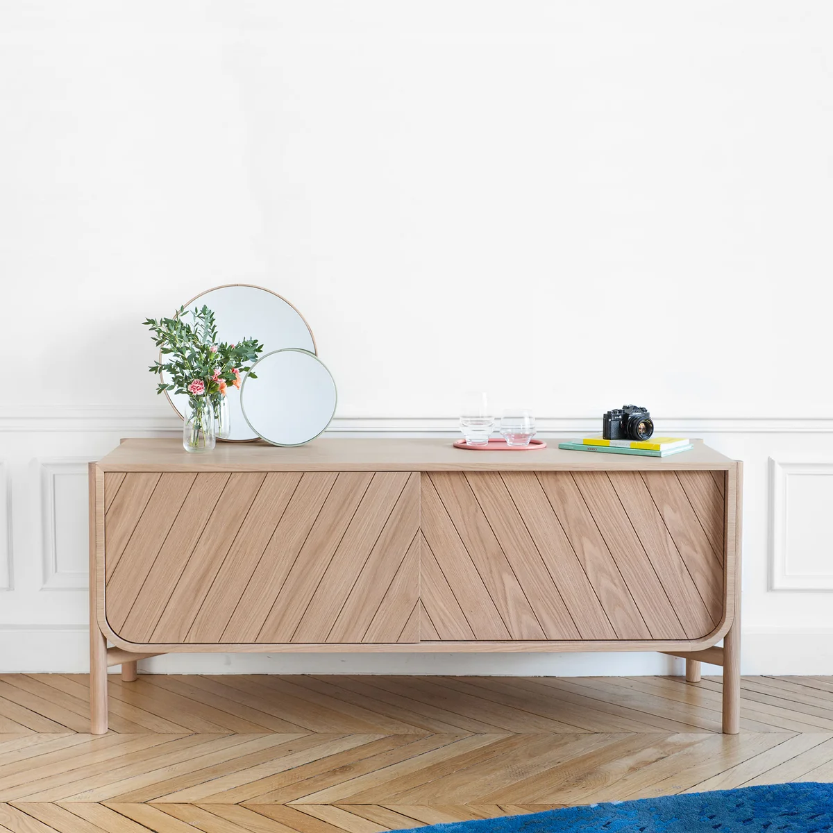 Avec ses courbes arrondies, le sideboard fait allusion à la forme de la coque d'un bateau, tandis que le motif sur les deux portes rappelle les voiles. Derrière les deux portes coulissantes au motif de voile se cachent deux niveaux sur lesquels il est possible de ranger discrètement vaisselle, livres, dossiers et bien d'autres choses encore.