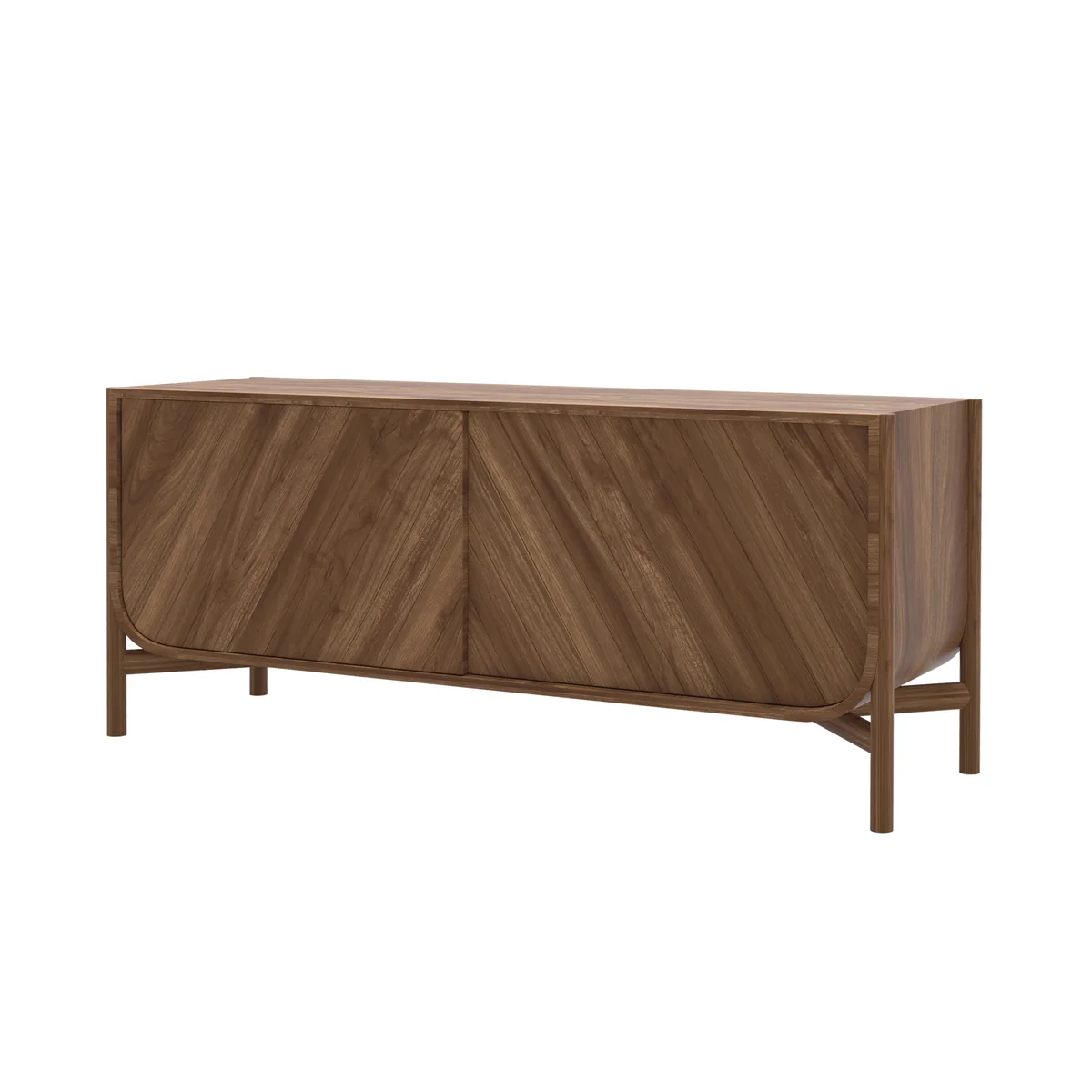Avec ses courbes arrondies, le sideboard fait allusion à la forme de la coque d'un bateau, tandis que le motif sur les deux portes rappelle les voiles. Derrière les deux portes coulissantes au motif de voile se cachent deux niveaux sur lesquels il est possible de ranger discrètement vaisselle, livres, dossiers et bien d'autres choses encore.