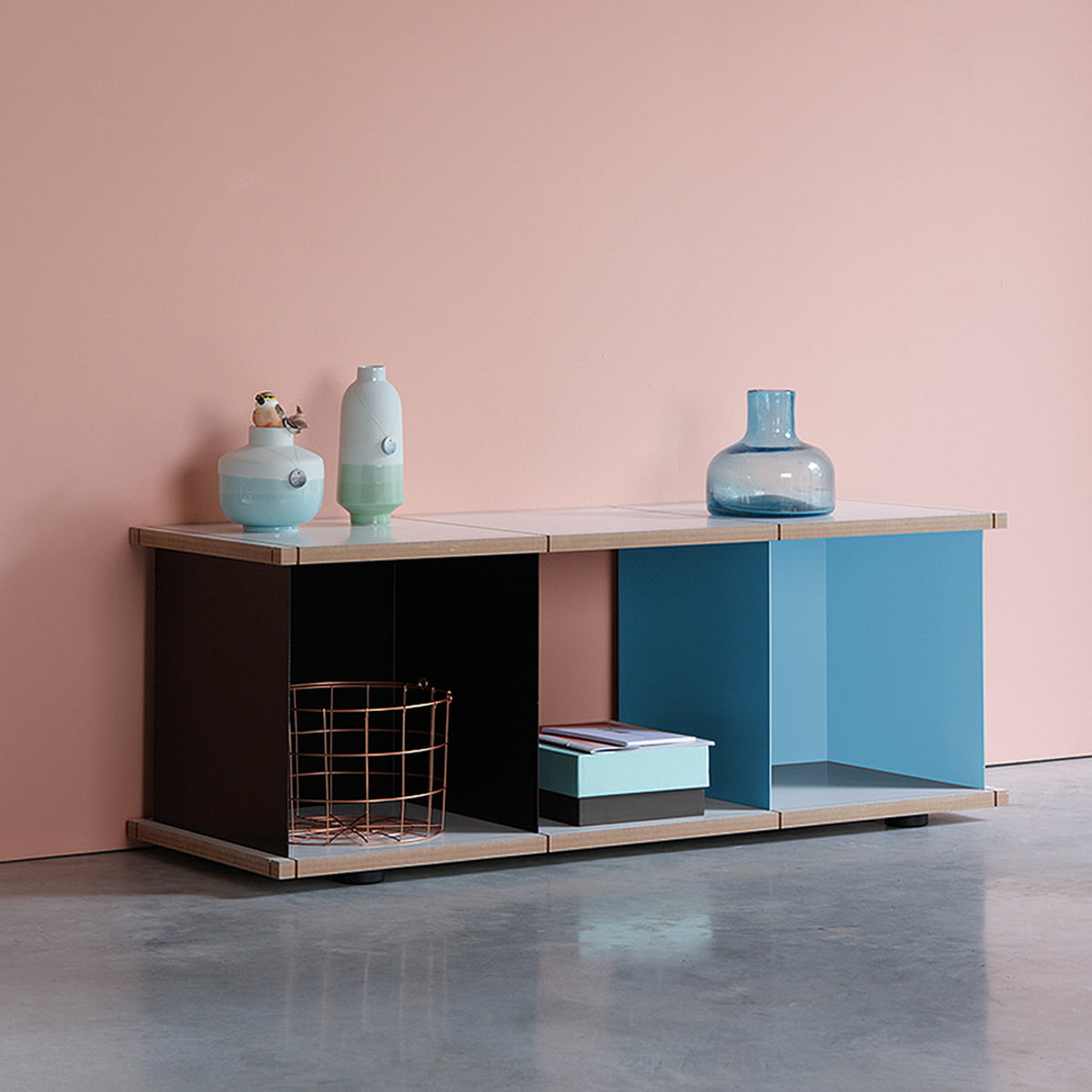 Les caissons en tôle d'acier revêtu par poudre en différentes couleurs se marient de manière intemporelle avec les planches intermédiaires en MDF, rendant le système d'étagères à la fois moderne et flexible. Les possibilités d'utilisation du système extensible sont infinies.