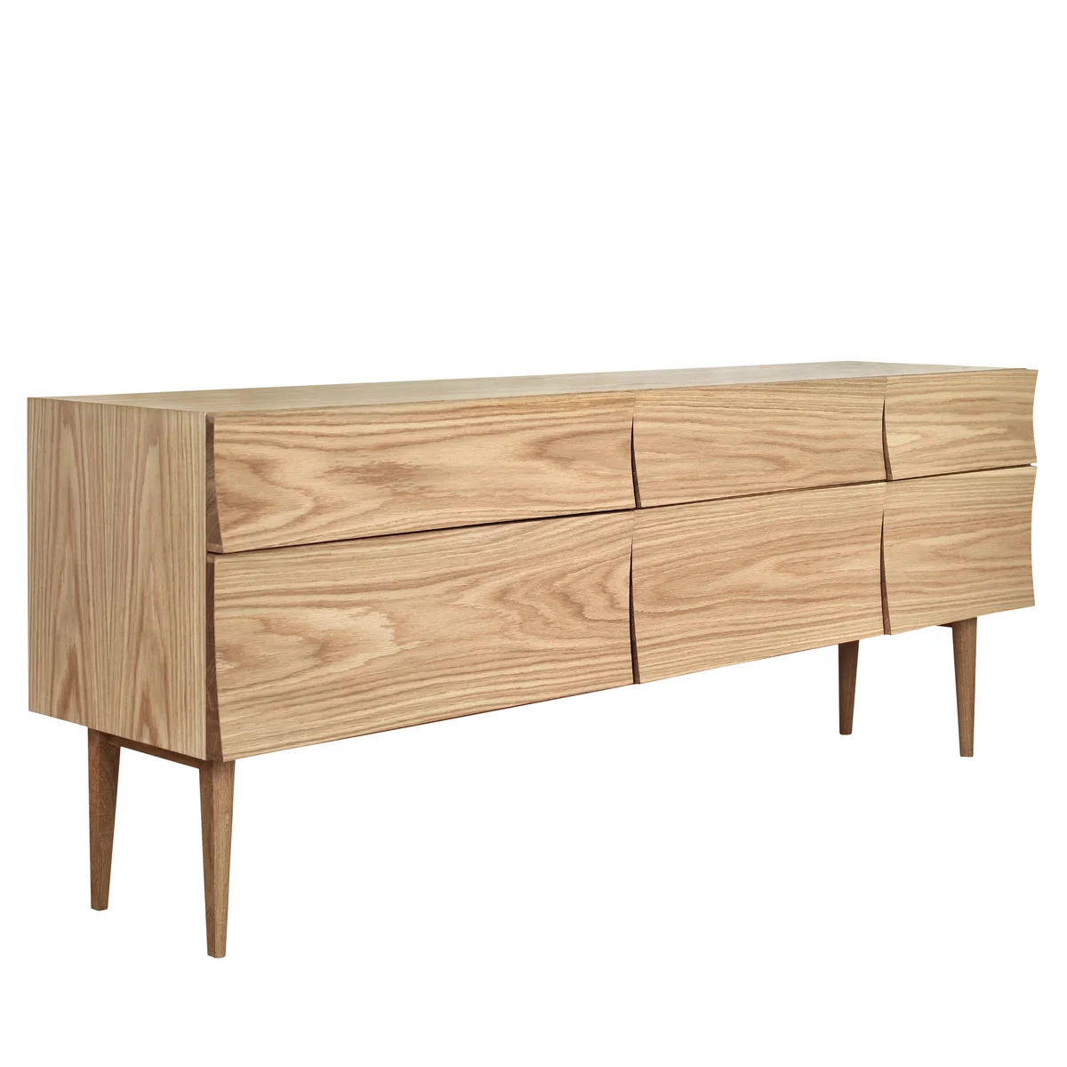 Le bois à partir duquel la façade du buffet Reflect est fabriquée a des profondeurs et des courbes différentes. Les coins des tiroirs individuels sont arqués vers l'avant, imitant l'ombre projetée et les reflets de la lumière sur le bois.