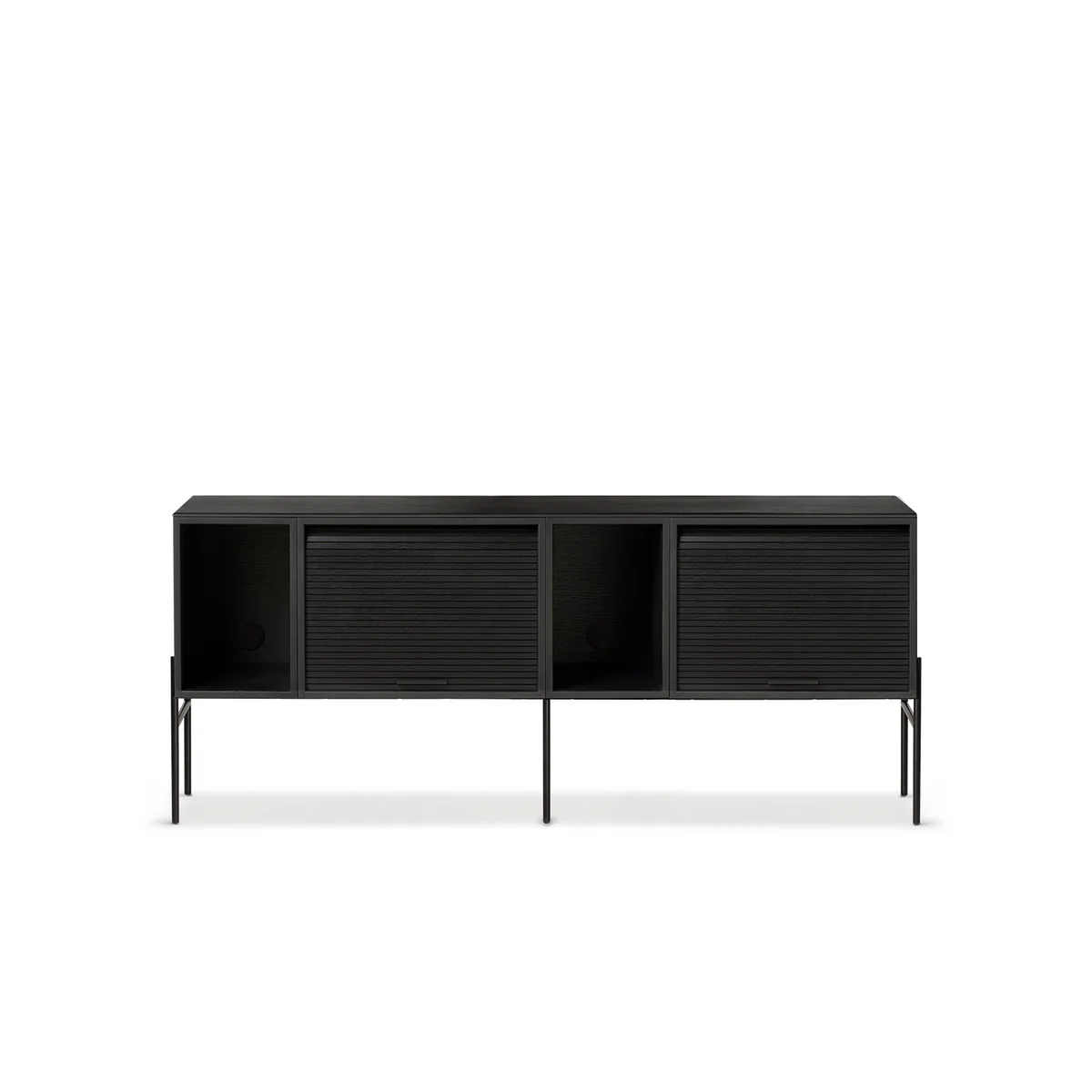 L'armoire Hifive avec ses portes roulantes pratiques n'est pas seulement esthétique, elle cache aussi par exemple les chaînes hi-fi inesthétiques, les récepteurs - si Hifive est utilisé comme armoire TV - ou encore les classeurs. Les unités sont reliées par un panneau en bois sur la surface et trônent sur une structure métallique élancée qui confère au sideboard élégance et légèreté.
