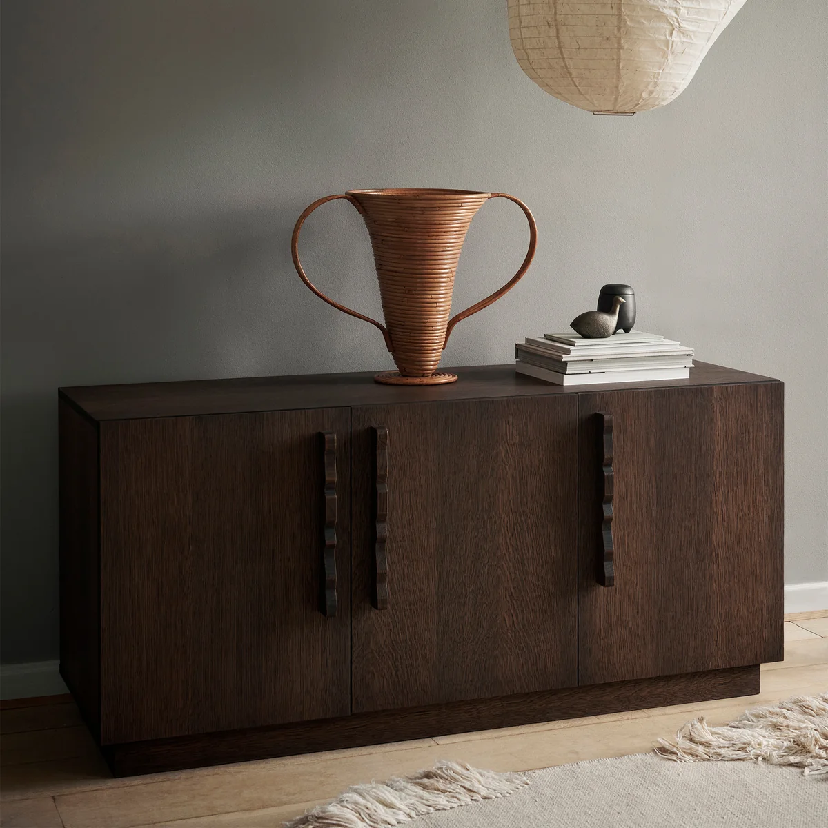 Le Unda Sideboard de la maison danoise Ferm Living est une superbe fusion entre une esthétique robuste et classique qui contraste avec les poignées fantaisistes. L'interaction fantastique entre une fonctionnalité de haut niveau et un caprice plein d'ambiance donne naissance à un meuble intemporel qui est merveilleusement mis en valeur dans toutes les pièces. Unda est fabriqué en chêne teinté foncé certifié FSC™.