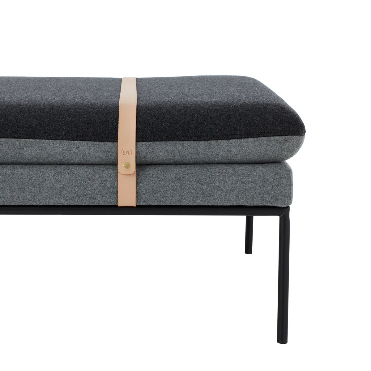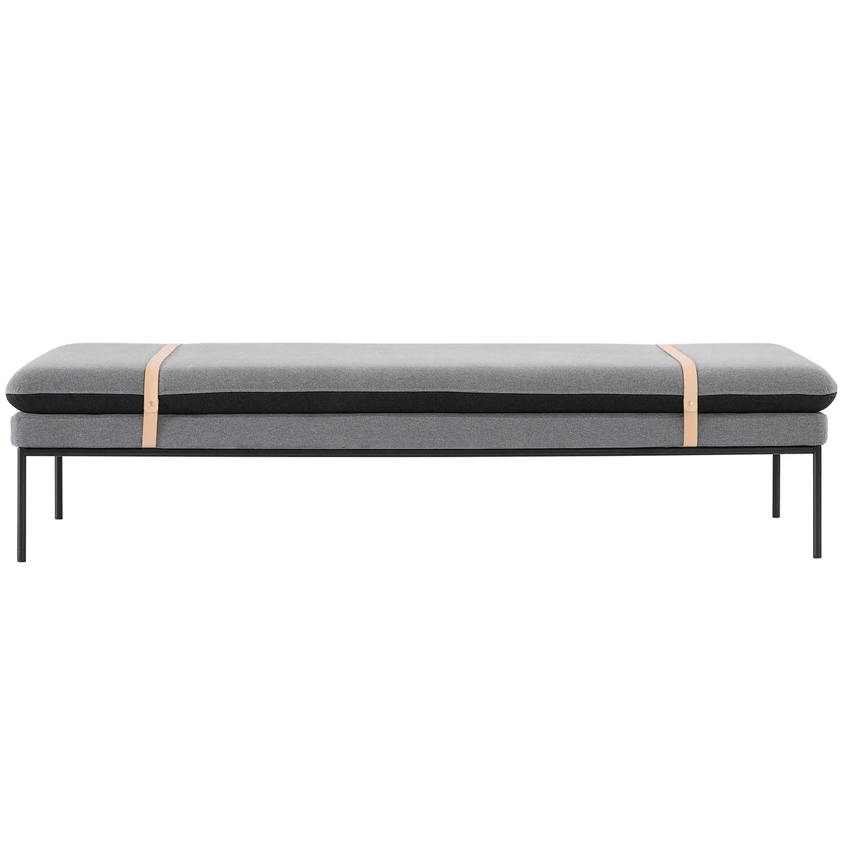 Une simple structure en métal forme la base de la chaise longue et répand un charme légèrement industriel. L'oreiller souple de 1,90 m de long repose dessus et est maintenu en place par deux élégantes sangles en cuir. Non seulement ils fournissent un soutien, mais ils agissent également comme un détail contrastant qui attire immédiatement l'attention. L'oreiller réversible définit également des accents de couleur, qui peuvent être retournés selon vos préférences et votre humeur, puis simplement fixés avec les lanières en cuir.