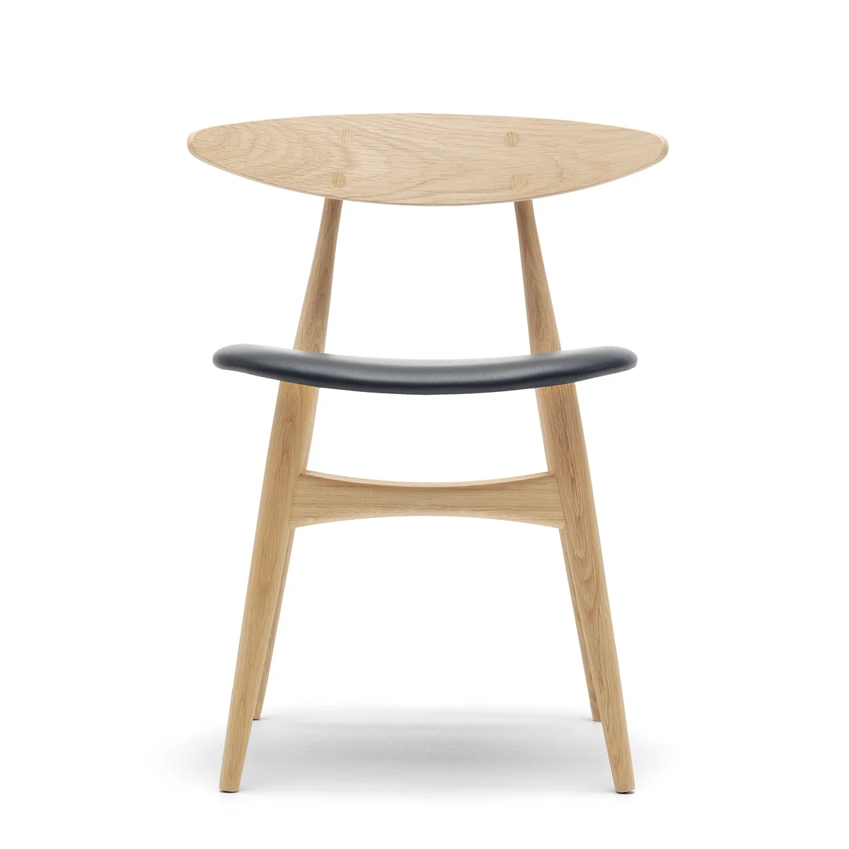 Les raccords entre les pieds arriĂšre et le dossier sont des exemples visibles et classiques de l'amour de Hans J. Wegner pour un design honnĂȘte, basĂ© sur un artisanat solide. Dans ce contexte, les boutons du dossier de la chaise sont toujours dans la mĂȘme finition bois que le cadre de la chaise. Un Ă©lĂ©ment de liaison qui rĂ©unit le piĂštement massif et le dossier en placage, non seulement sur le plan statique, mais aussi sur le plan visuel.