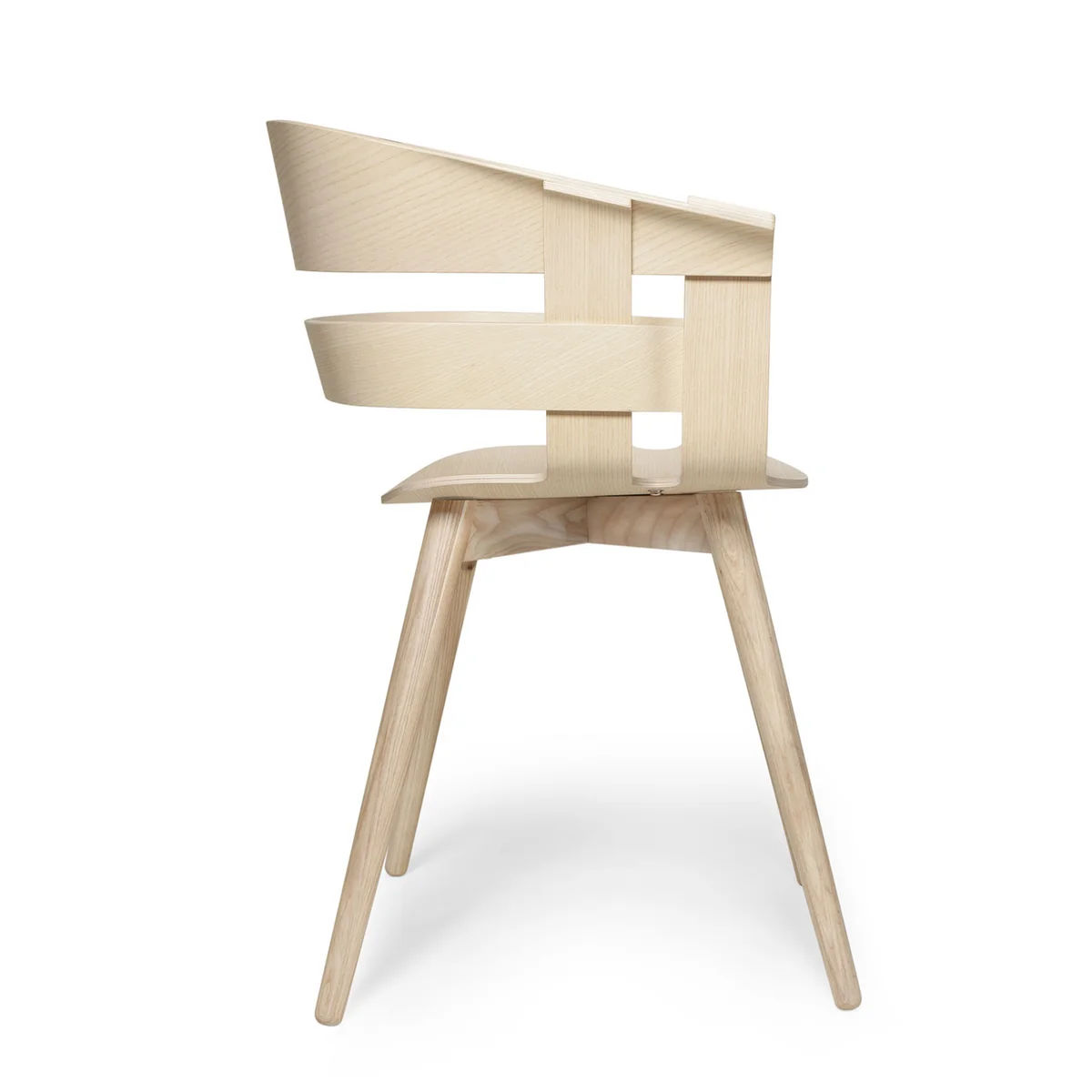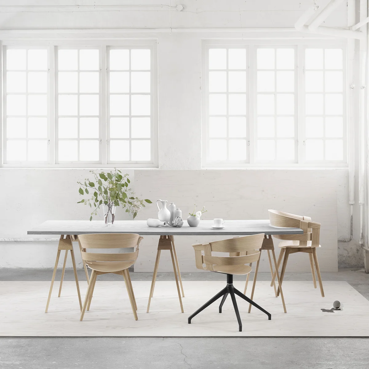 La chaise Wick est disponible dans différentes versions. Non seulement entre chêne naturel, laqué noir ou en naturel cendré, différentes bases sont possibles, en bois, en acier ou avec un piètement pivotant, de façon à pouvoir adapter la chaise à différents espaces comme chaise de salle à manger classique, ainsi qu'au bureau ou espace de conférence.