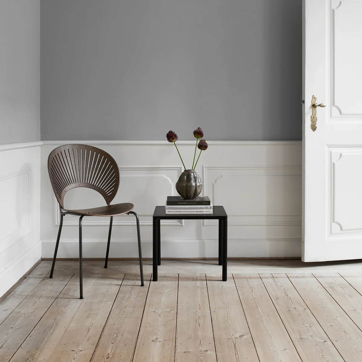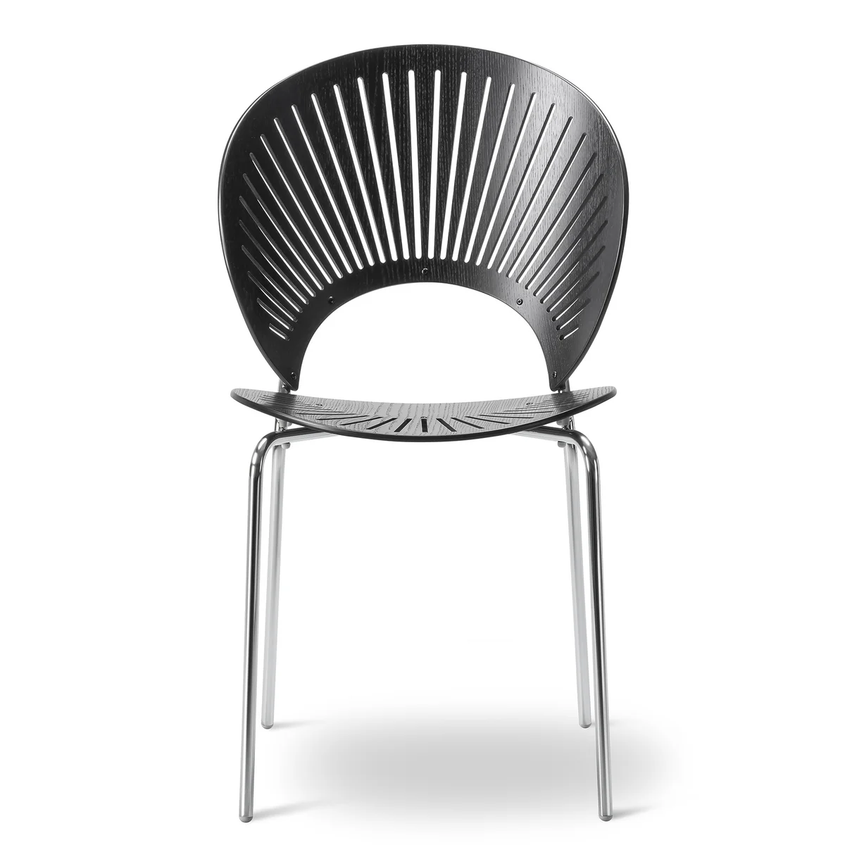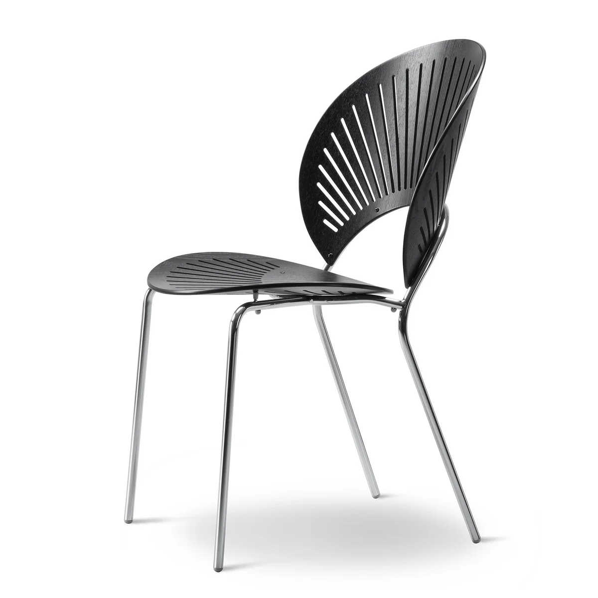 La chaise Trinidad est disponible en différentes essences de bois dans différentes couleurs. Le piétement de la chaise est en acier peint par poudrage ou chromé. La chaise est également disponible en version tabouret de bar et en version avec accoudoirs. Toutes les chaises Trinidad de Nanna Ditzel pour Fredericia sont produites au Danemark.