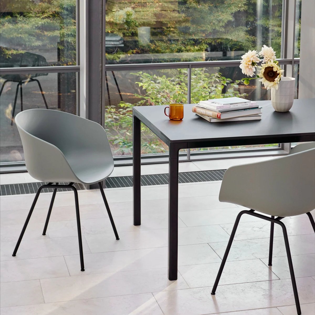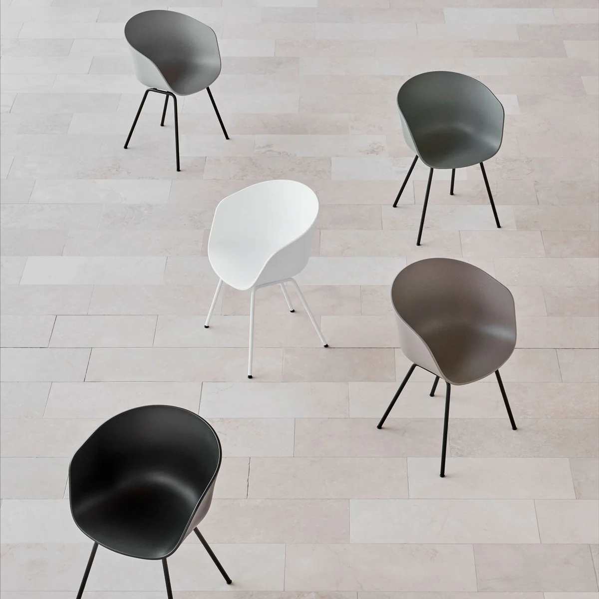 Le About A Chair AAC 26 de Hee Welling pour HAY a une base à quatre pieds en acier poli ou revêtu par poudre, ce qui confère à la chaise une expression plus formelle. La coque en polypropylène est disponible en différentes couleurs.