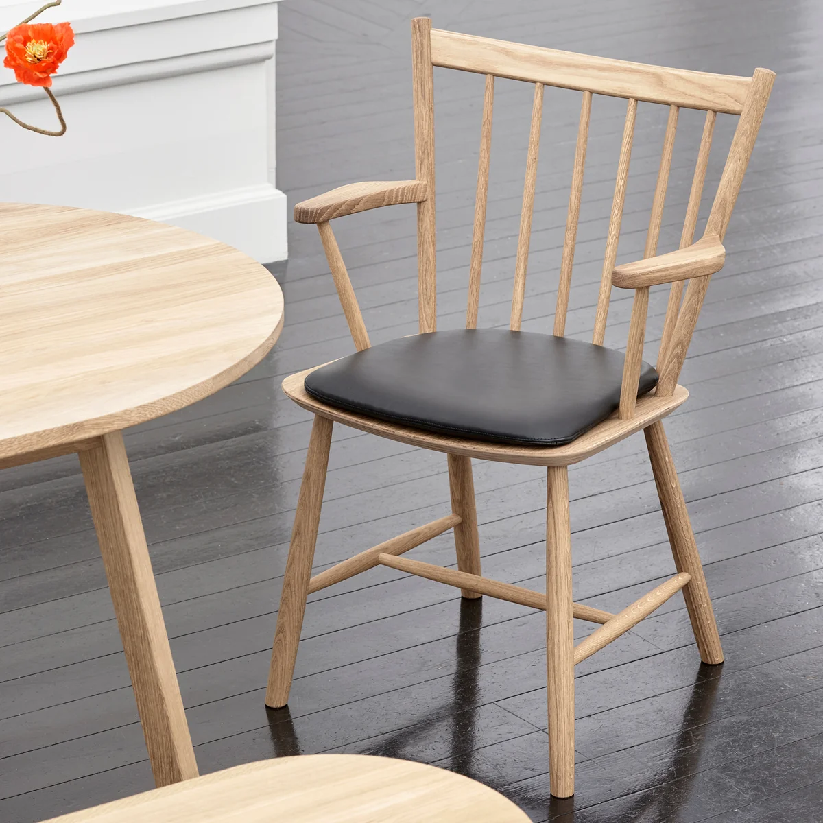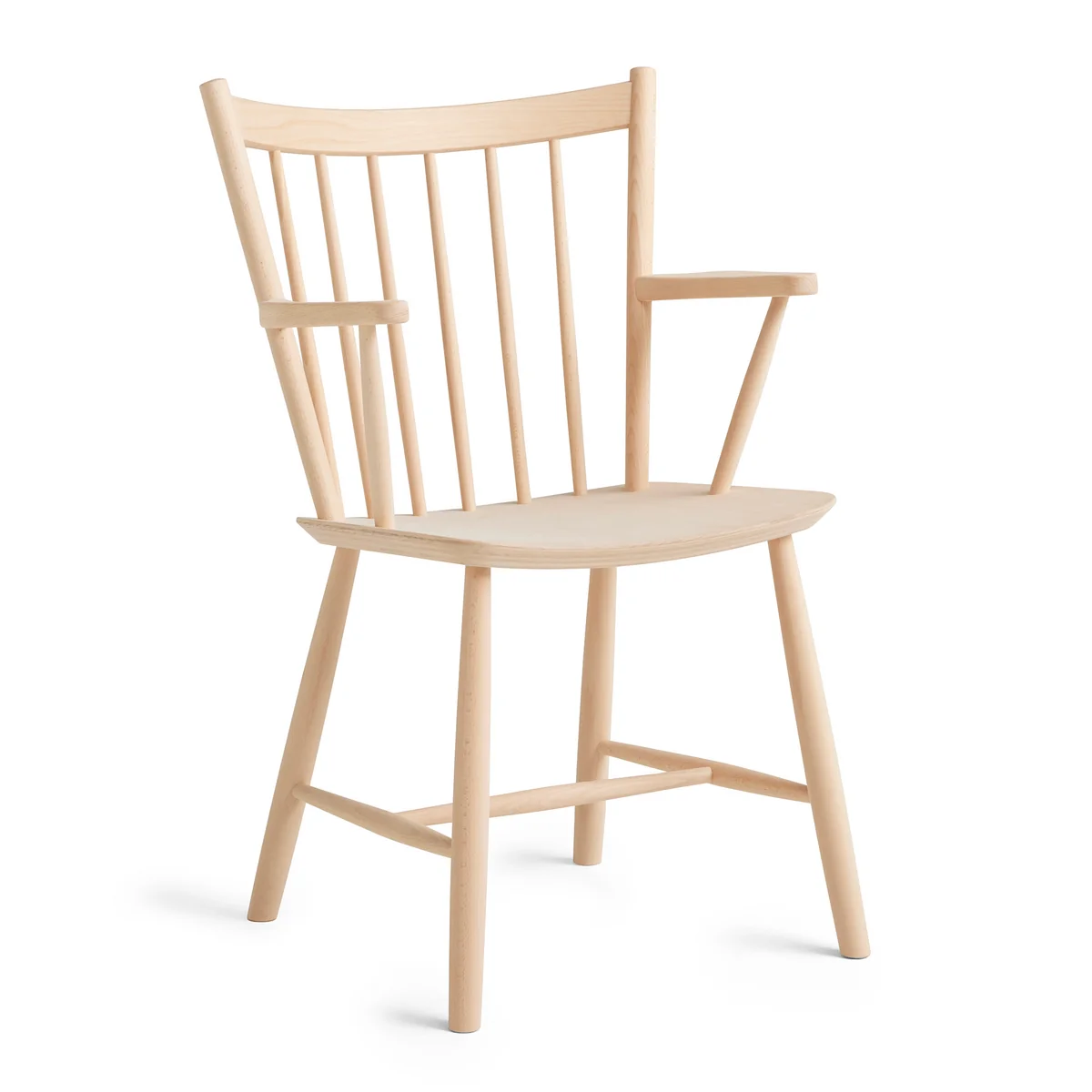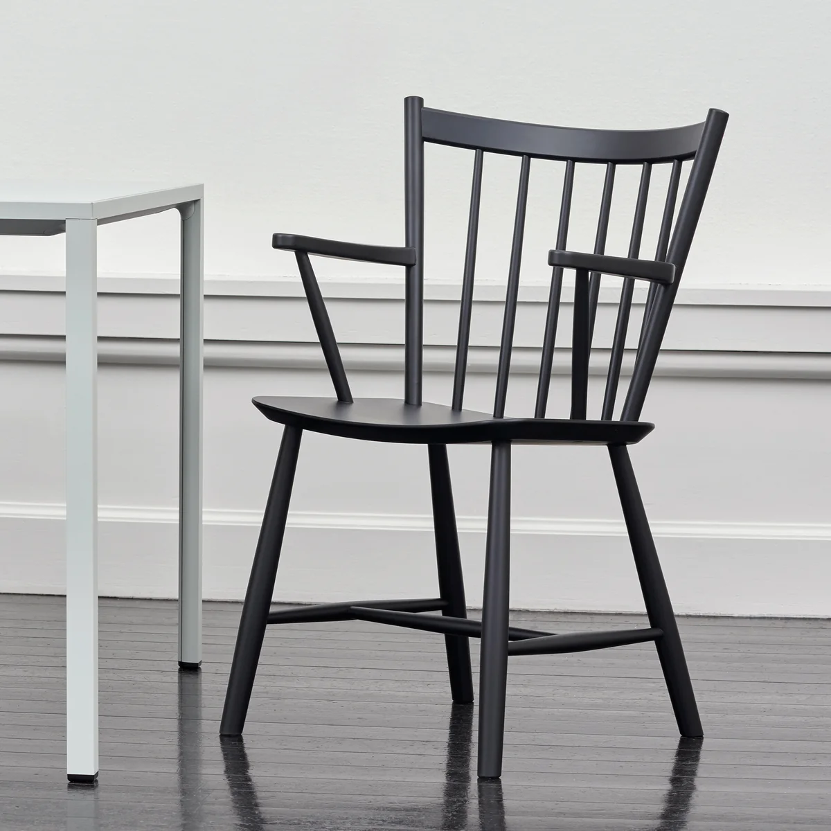 Inspirée des chaises Windsor traditionnelles, la chaise séduit par ses barreaux en bois largement espacés qui, tout comme les accoudoirs et les pieds, sont fabriqués en chêne ou en hêtre massif, naturel ou laqué de différentes manières. L'assise est fabriquée en contreplaqué. Qu'elle soit utilisée dans différents espaces privés ou publics, cette chaise ne manquera pas d'attirer l'attention.