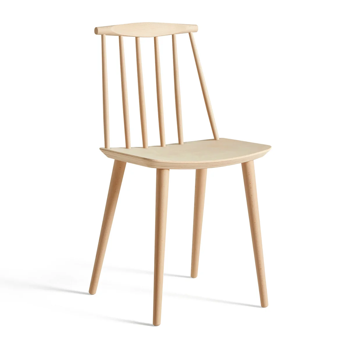 La fabrication en bois de hêtre et la forme élancée des tiges au niveau du dossier confèrent à la J77 Chair de HAY une impression à la fois légère et massive. La large assise rend le J77 confortable, tandis que son design classique et minimaliste lui permet de s'intégrer dans des environnements très différents.