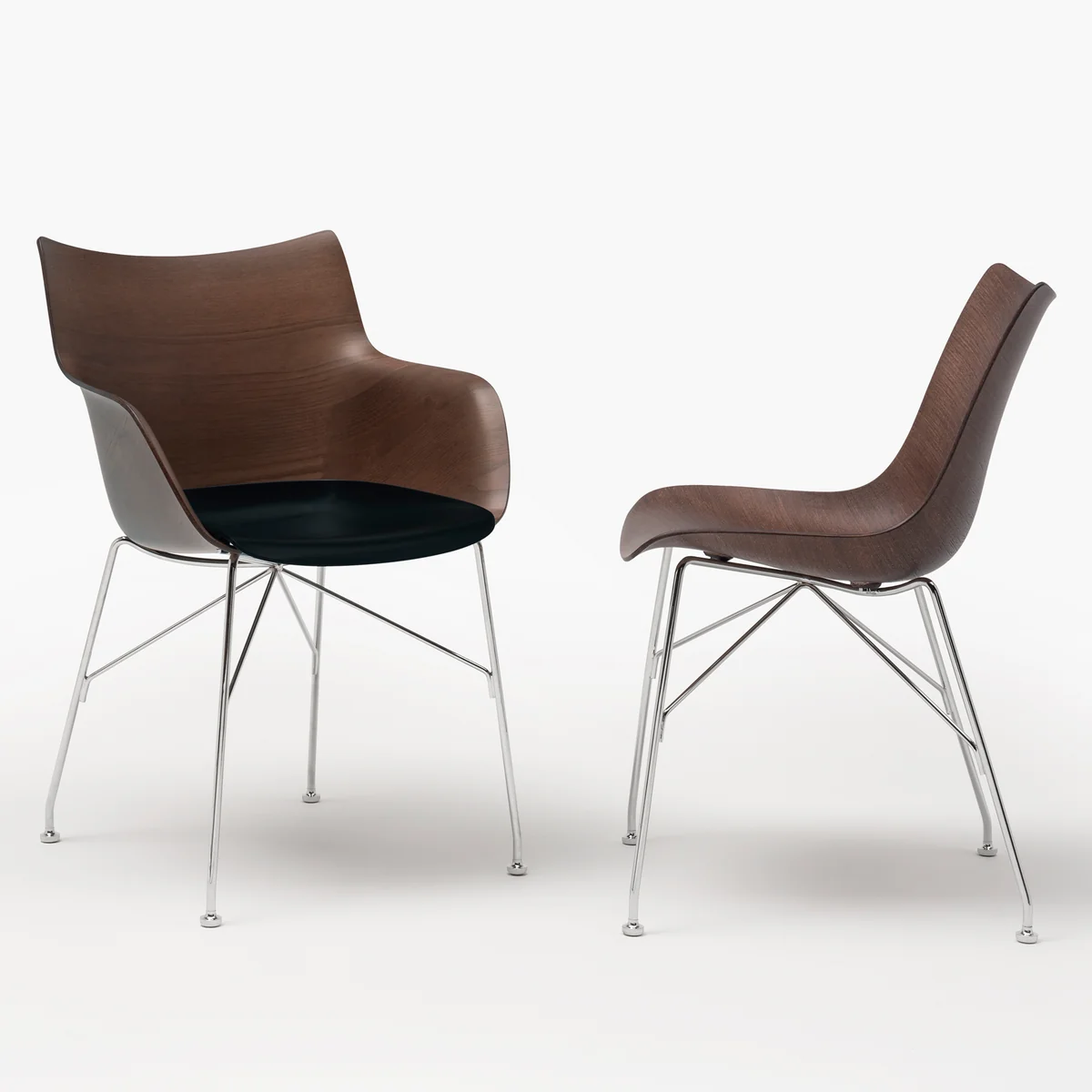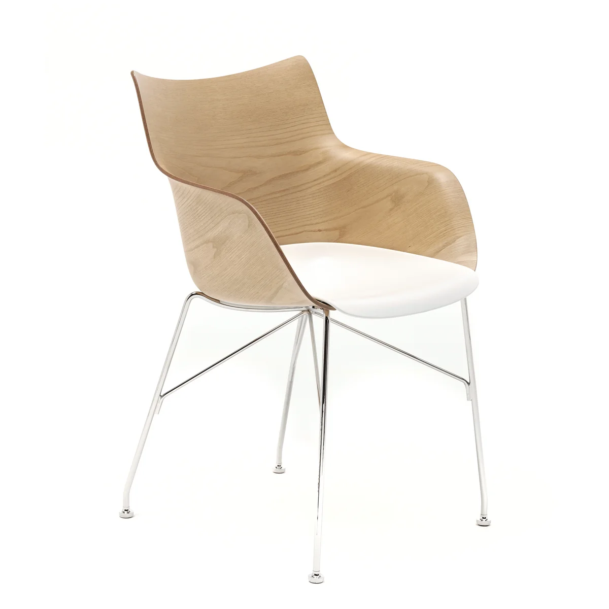 La chaise à accoudoirs Q/Wood de Kartell se compose d'un piètement à quatre pieds en acier laqué ou chromé. La coque d'assise est pliée en 3D à partir de bois clair ou foncé. L'assise est disponible en technopolymère thermoplastique teinté dans la masse en noir ou en blanc. Grâce à ses différentes combinaisons, le fauteuil s'adapte à tous les goûts et à tous les intérieurs.