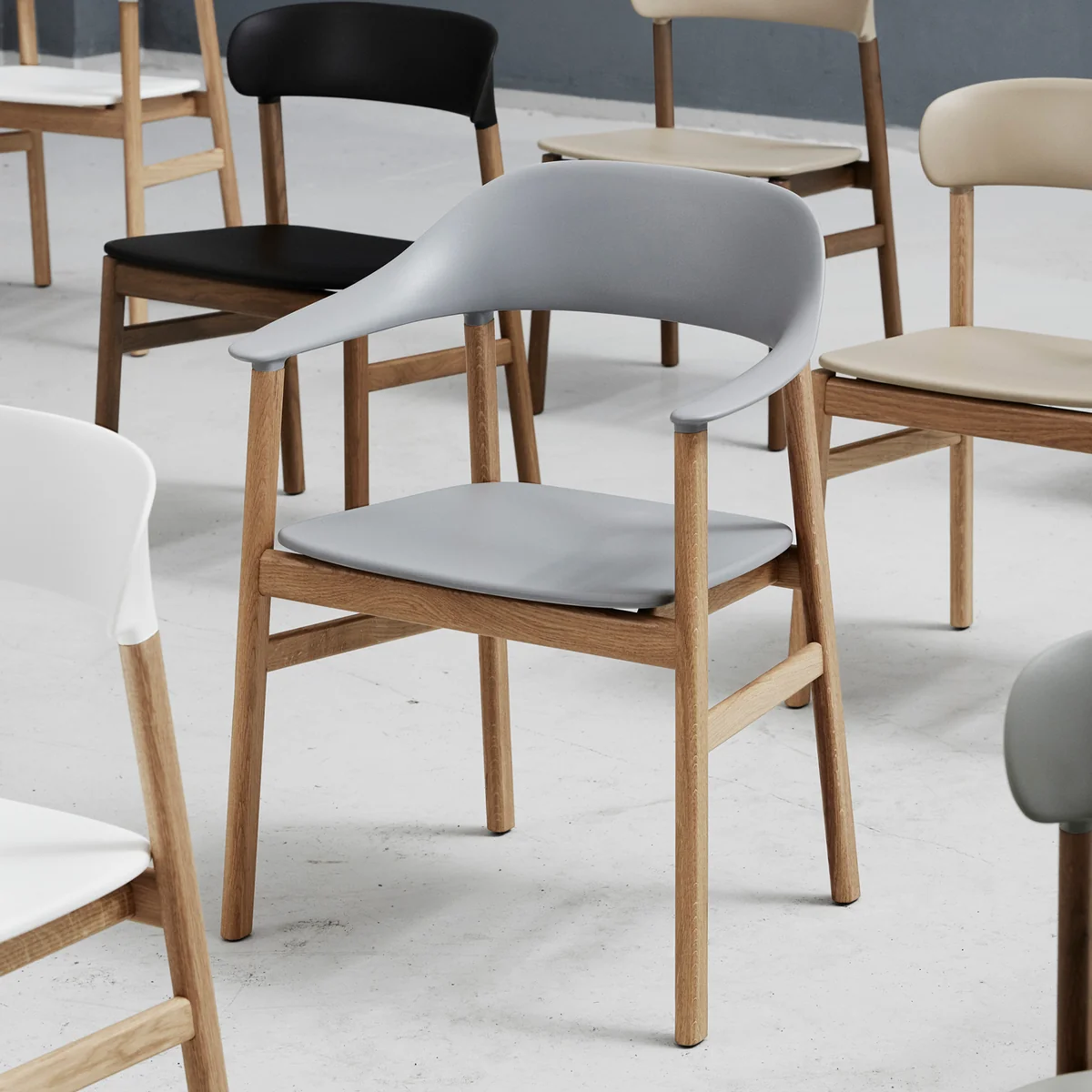 Le fauteuil Herit de Normann Copenhagen reflète l'enthousiasme du designer Simon Legald pour l'histoire du design de meubles danois. La chaise se compose d'un cadre en bois avec assise et dossier en plastique.