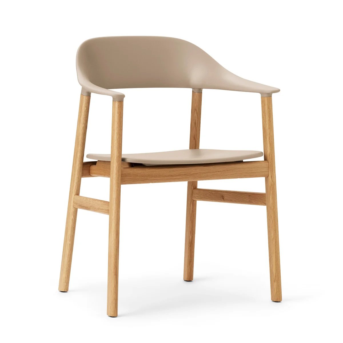 Le fauteuil Herit de Normann Copenhagen reflète l'enthousiasme du designer Simon Legald pour l'histoire du design de meubles danois. La chaise se compose d'un cadre en bois avec assise et dossier en plastique.