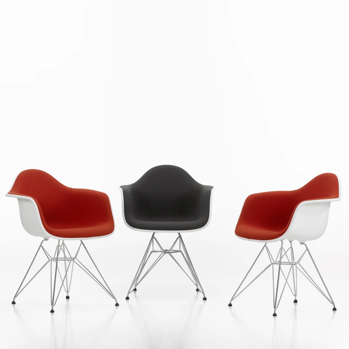 La chaise Eames Plastic Armchair DAR entièrement rembourrée de Vitra allie un design emblématique à un confort maximal. Conçue par Charles et Ray Eames, cette chaise séduit par sa coque d'assise ergonomique entièrement rembourrée de tissu de qualité. Le piètement métallique caractéristique au design "Tour Eiffel" confère à la chaise une base à la fois élégante et stable.