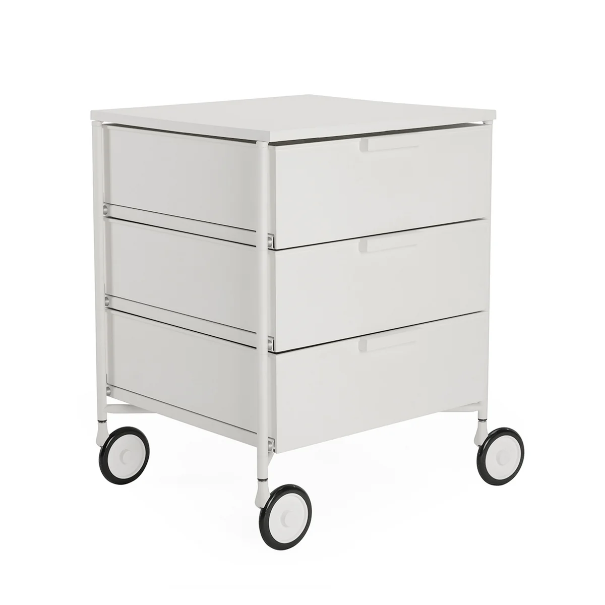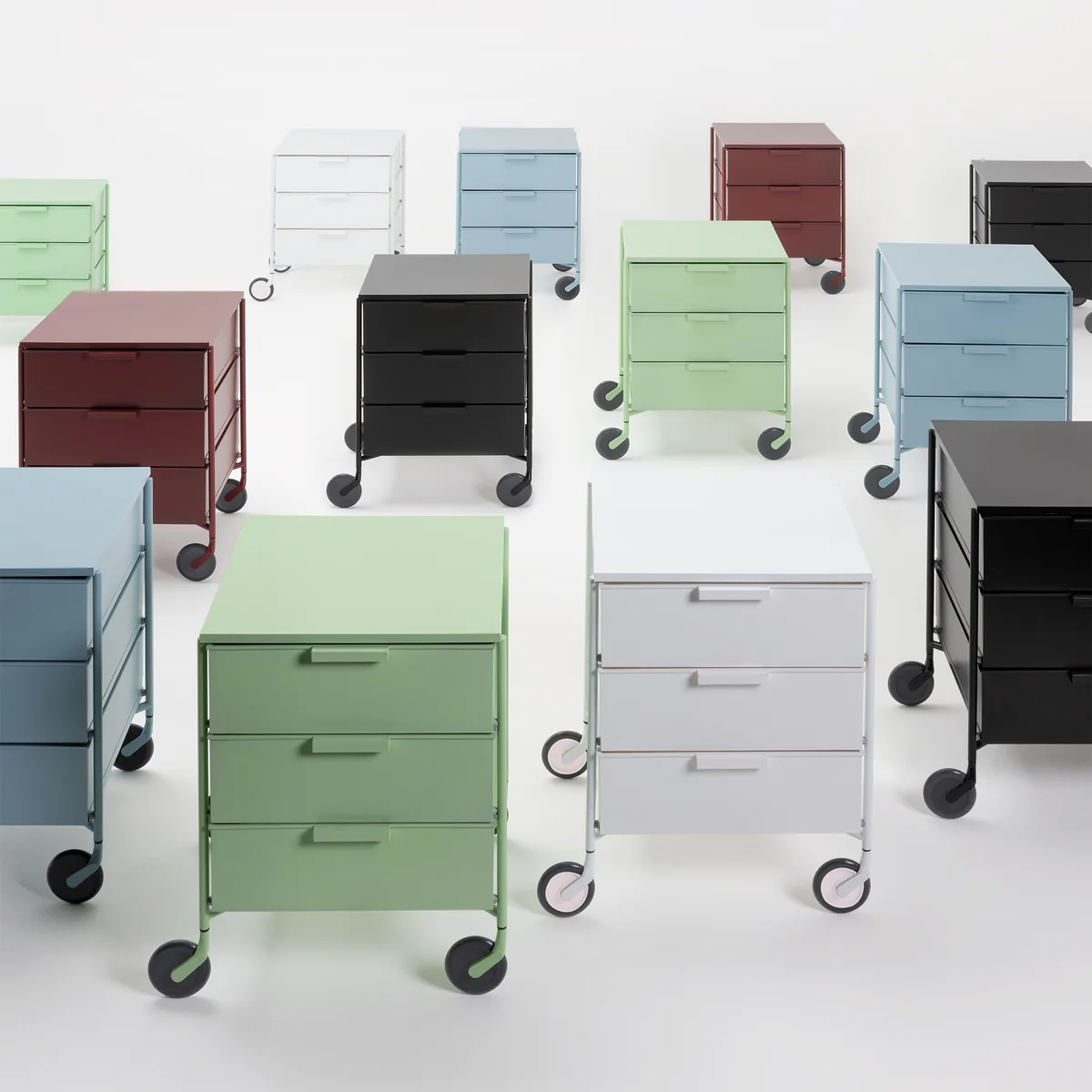 Le conteneur roulant Mobil d'Antonio Citterio et Oliver Löw pour Kartell caractérise par sa fonctionnalité et sa construction robuste. L'armoire à tiroirs roulante est légère et polyvalente en raison de sa flexibilité. Que ce soit dans le salon, dans la chambre à coucher ou au bureau - avec les meubles en conteneurs, le tri et le rangement sont faciles, car l'aide pratique avec ses trois tiroirs offre suffisamment d'espace pour les documents et autres ustensiles.