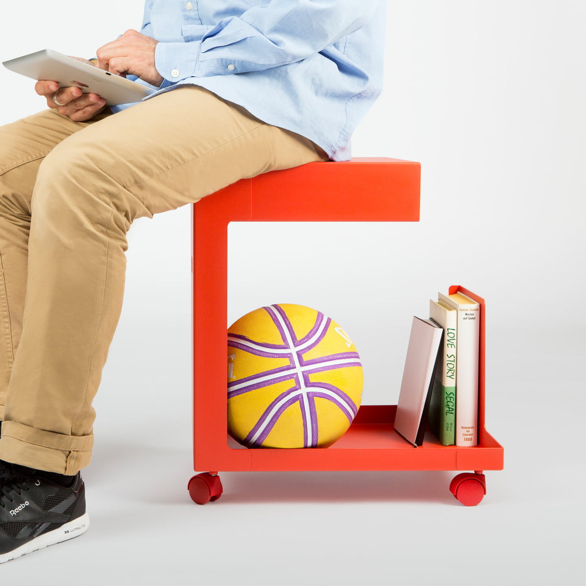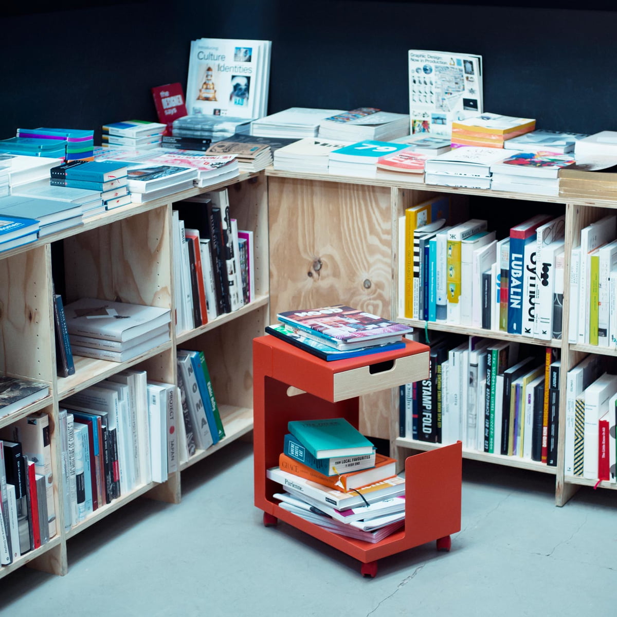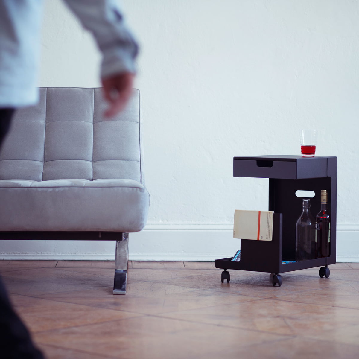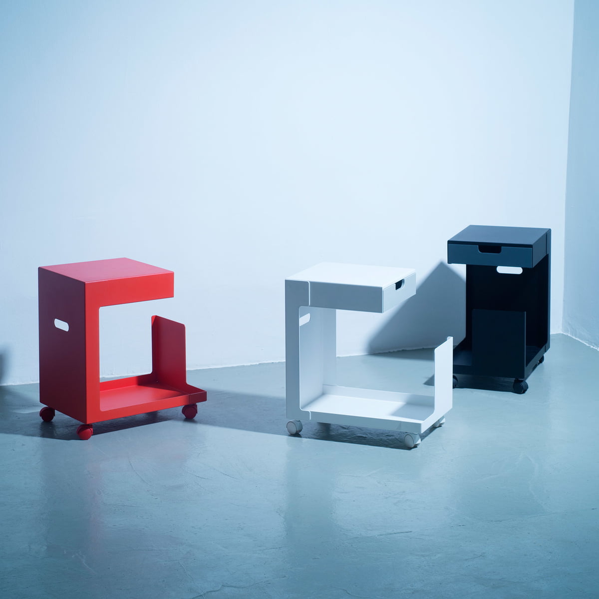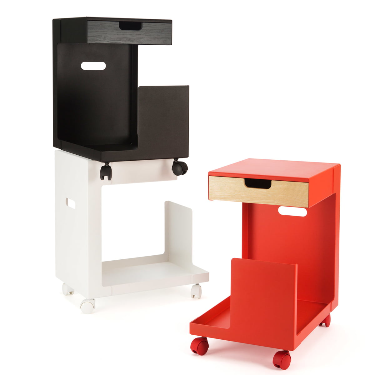 La forme ouverte de la désserte mobile ED n'offre aucune fonction explicite, mais est polyvalente pour différentes applications : ED est un stockage agile pour les appareils mobiles tels que des ordinateurs portables ou tablettes, comme table d'appoint avec espace de stockage, ou comme moyen d’assise spontané pour les visiteurs au bureau.