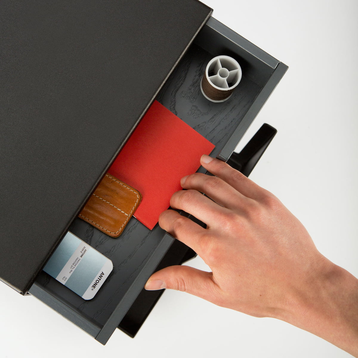 ED est un conteneur que le fabricant L & Z produit à partir d’une seule pièce pliée en tôle d'acier. Le tiroir est conçu en bois de frêne, qui selon le choix, est disponible en gris clair ou foncé gris.