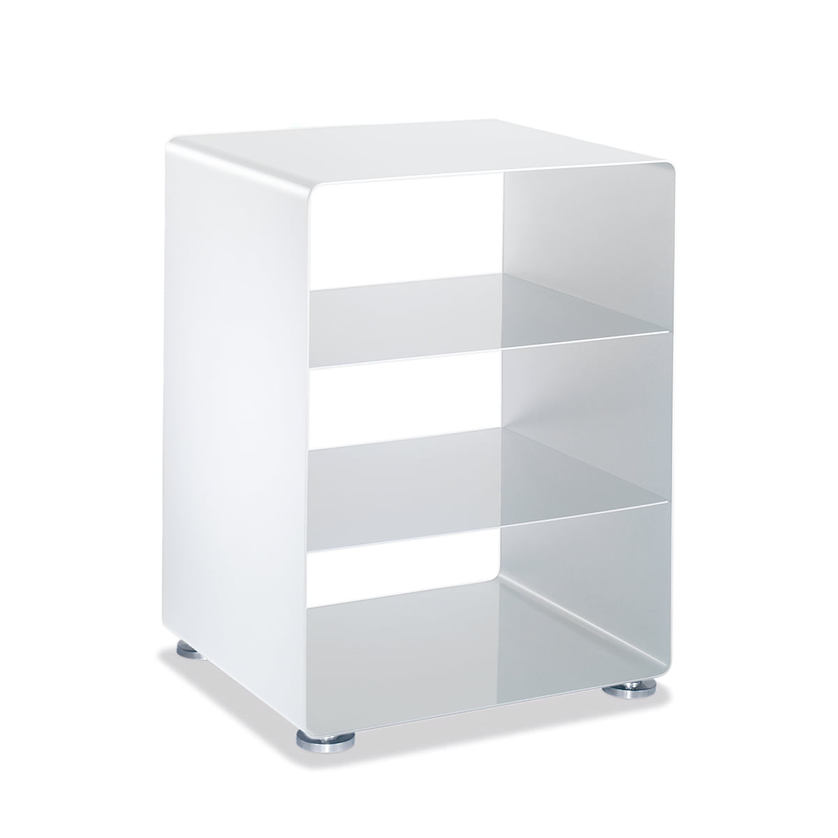 Outre la variante avec pieds chromés, le meuble hi-fi intemporel est également disponible en modèle mobile avec roulettes industrielles, ainsi qu'avec de nombreux laquages RAL, à choisir selon vos préférences.