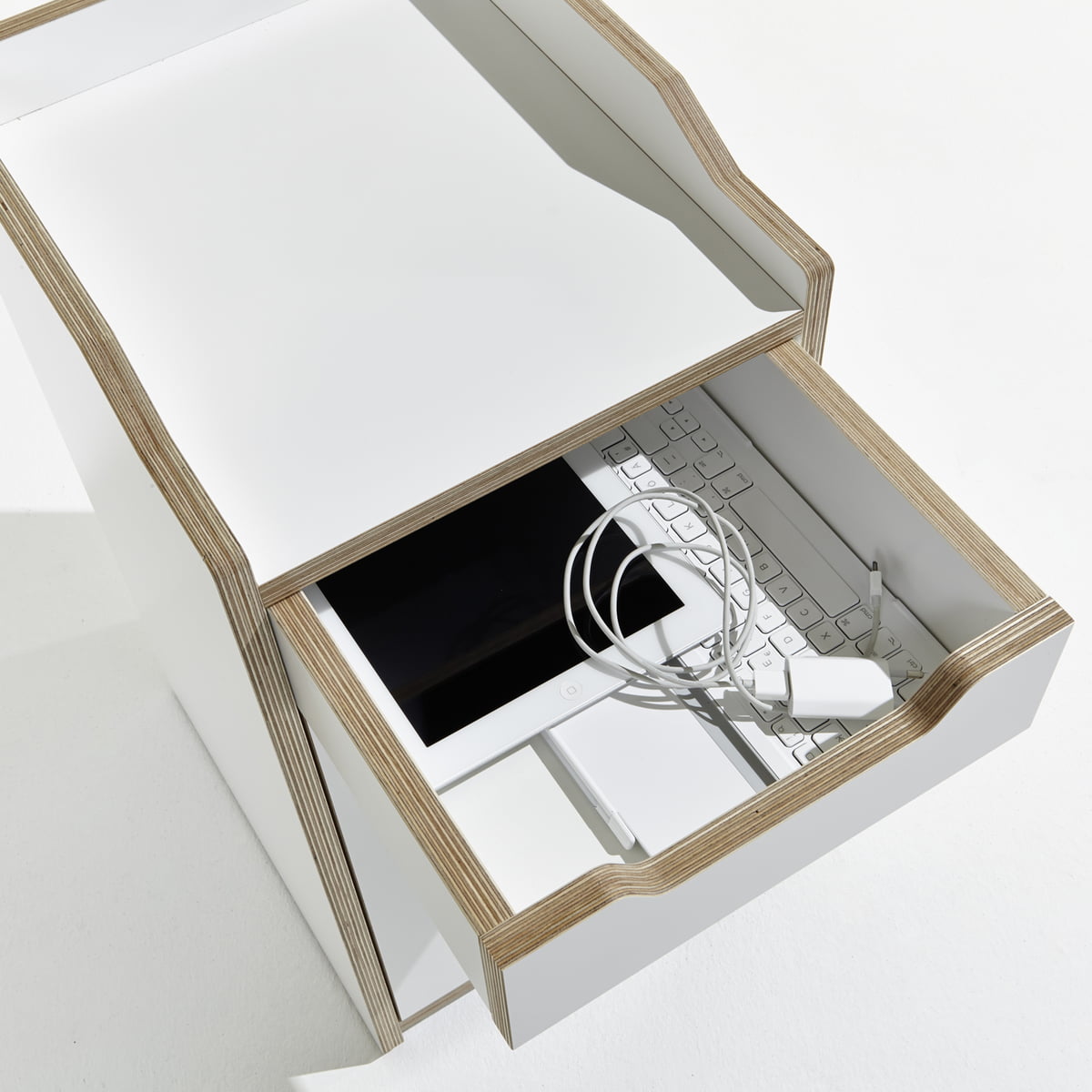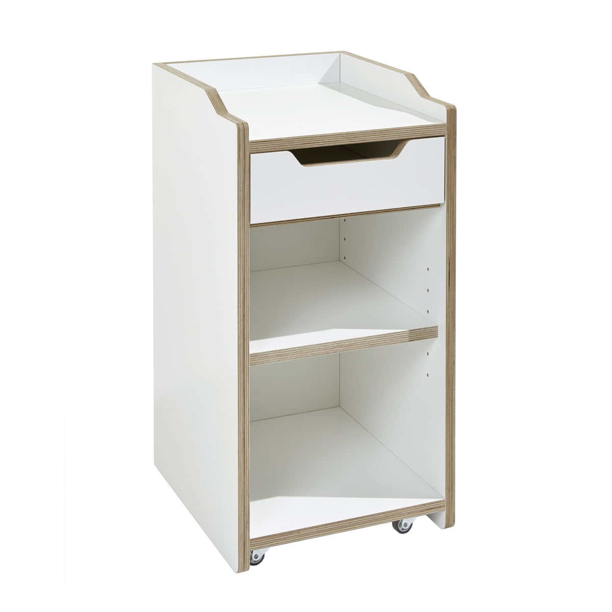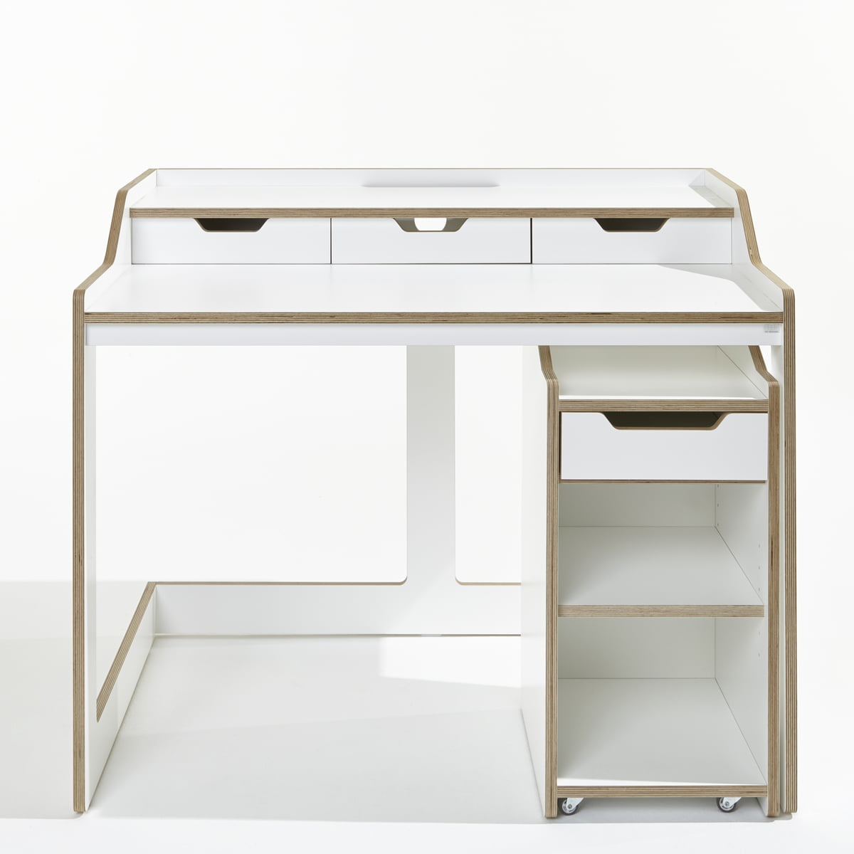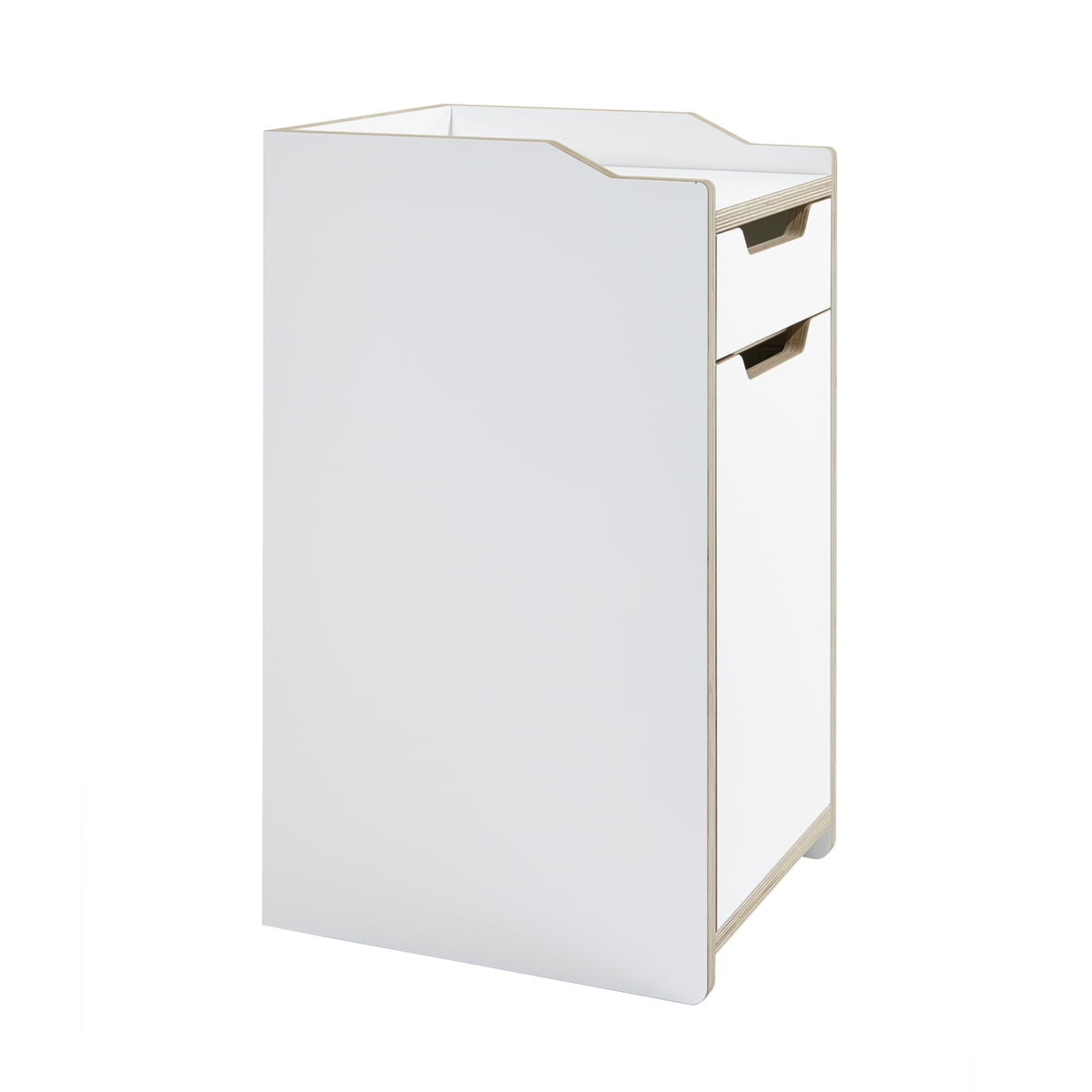 Le caisson Plane Container de Müller Möbelwerkstätten, conçu par Felix Stark, séduit par sa forme harmonieuse. Les faces avant du caisson sont composées de plateaux de bouleau en multiplex de 18 mm d'épaisseur, avec revêtement mélaminé en blanc, tandis que les arrêtes sont huilées et naturelles.