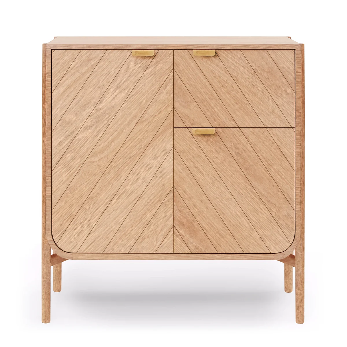 La commode d'une longueur de 120 cm dispose de trois compartiments de différentes tailles dans lesquels on peut ranger une multitude de choses et d'ustensiles. Dans le bureau, cette commode élégante sert par exemple d'armoire à dossiers, tandis que dans la chambre à coucher, elle fait office d'armoire alternative. Grâce à son design simple mais particulier, ce meuble s'intègre dans n'importe quelle ambiance et apporte une touche de fraîcheur.