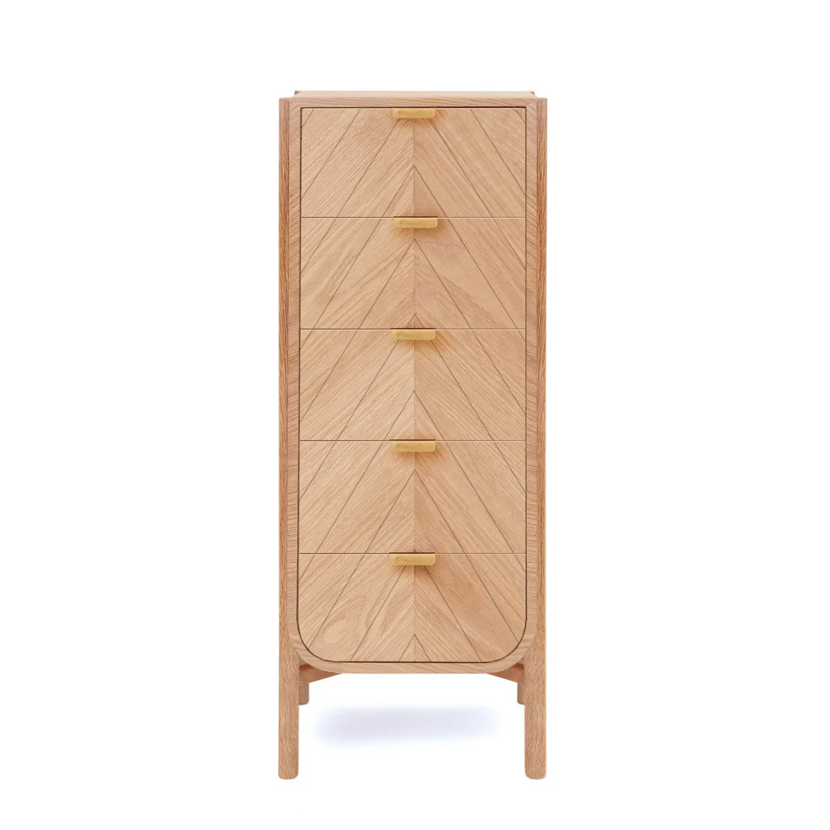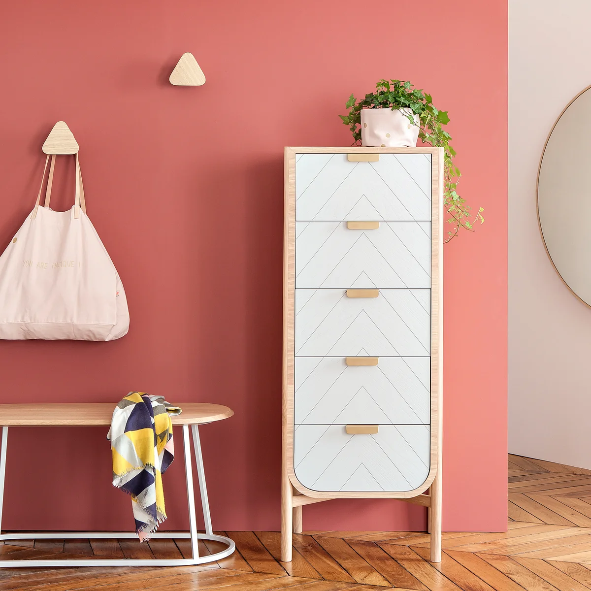 La commode étroite Marius est une création du fabricant français Hartô au look maritime. Les coins arrondis rappellent la forme de la coque d'un bateau, tandis que le motif sur les façades des tiroirs imite le contour triangulaire d'une voile.