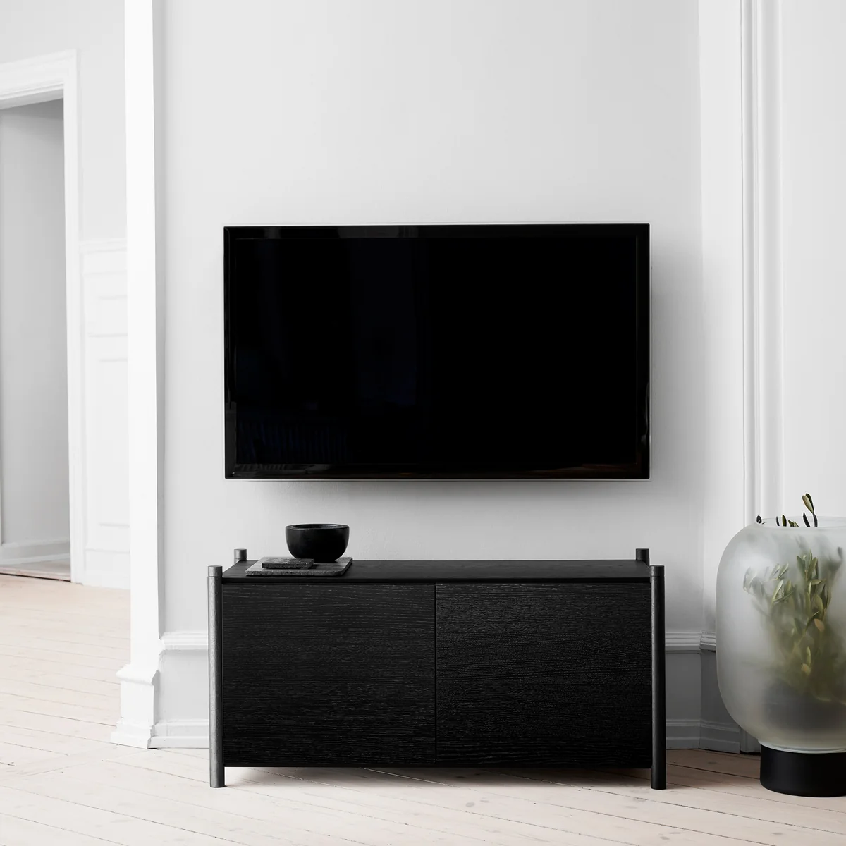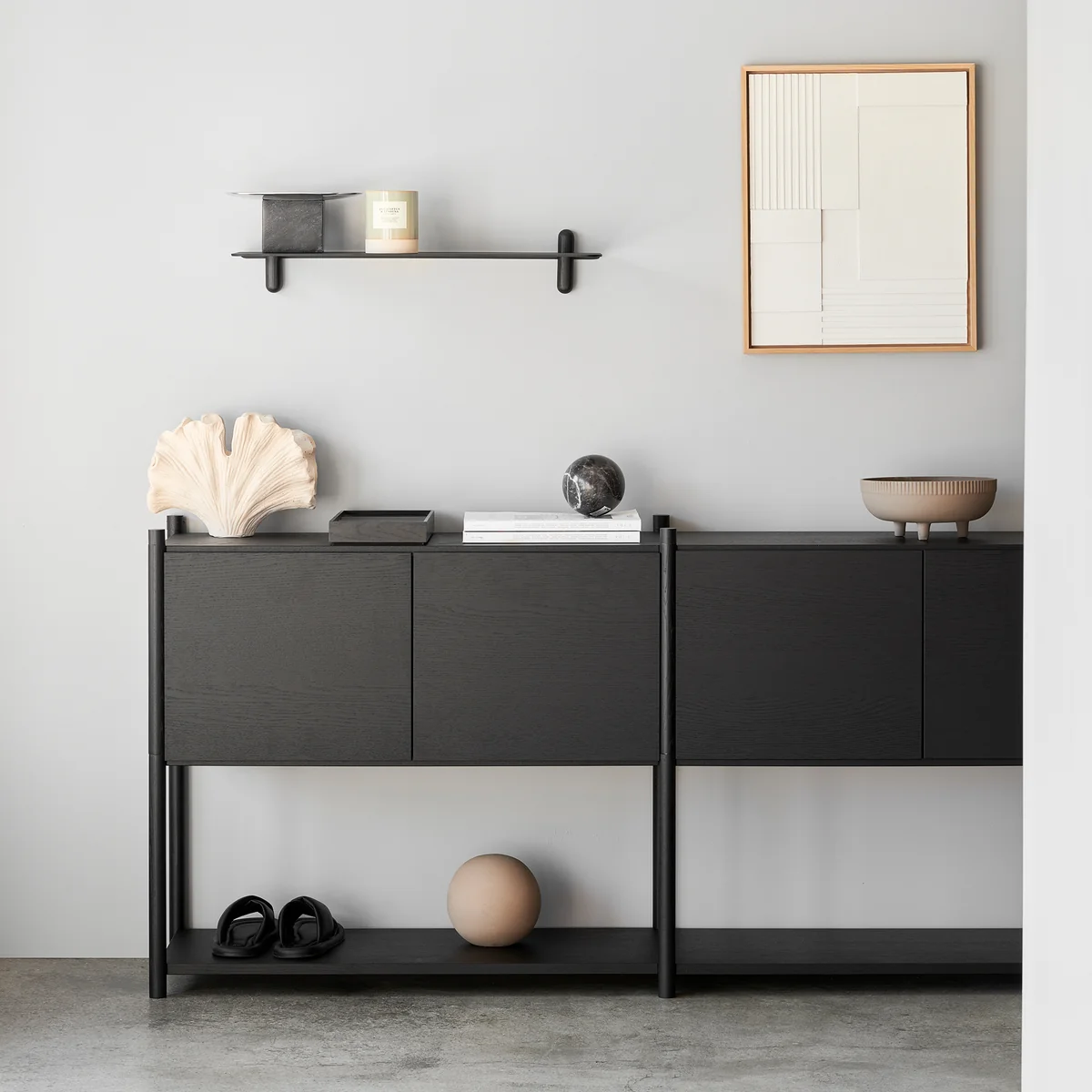 Le système d'étagères Sceene de Michael Rem pour Gejst est un système modulaire qui permet d'aménager chaque pièce de manière flexible et individuelle. Module par module, le système d'étagères peut être monté vers le haut, étendu latéralement et personnalisé avec des parois latérales, des portes ou des parois arrière en bois de chêne.
