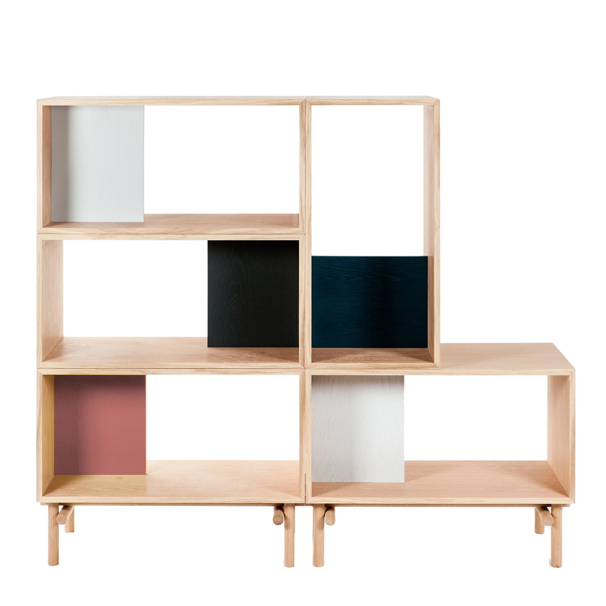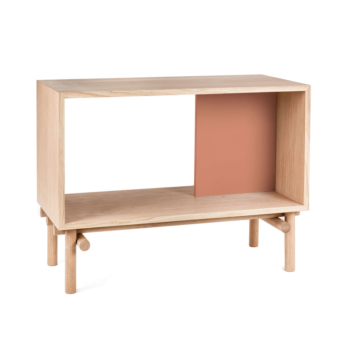 La base du système d'étagères est une boîte en MDF plaqué chêne, équipée d'une plaque intérieure laquée mat en différentes couleurs. Les modules peuvent être assemblés entre eux verticalement ou en diagonal par un système de montage simple. Les modules s'enfichent à l'aide de connexions en laiton et peuvent ainsi être démontés tout aussi facilement. Grâce à ce système de fixation, Edgar peut passer d'une simple boîte à un buffet ou à une bibliothèque et revenir à une boîte en quelques minutes seulement.