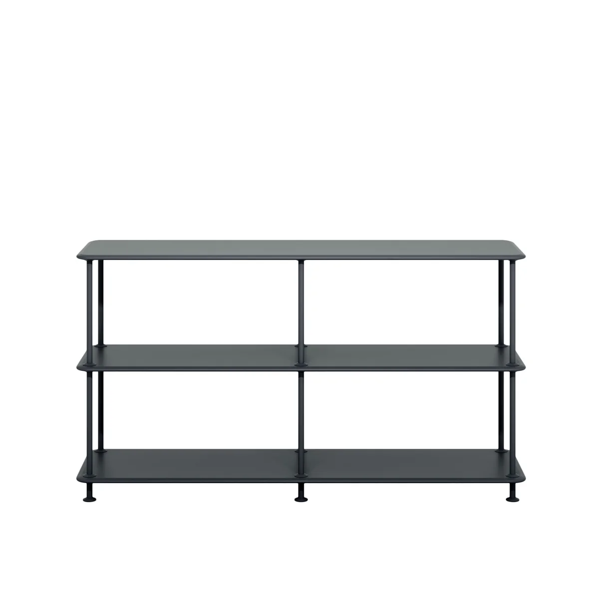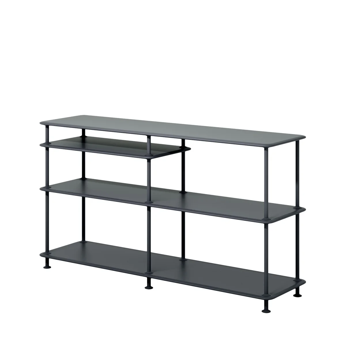 Les étagères sont en panneau MDF laqué de 16 mm d'épaisseur. De solides colonnes de métal revêtu de poudre maintiennent l'étagère ensemble. Les pieds sont réglables en hauteur et équipés de patins en plastique souple. Le sol est ainsi protégé du métal et la tablette est placée dans une position antidérapante. L'étagère peut être complétée par des panneaux textiles de votre choix, qui peuvent être cliqués entre les colonnes, jouant ainsi avec des éléments ouverts et fermés dans la pièce.