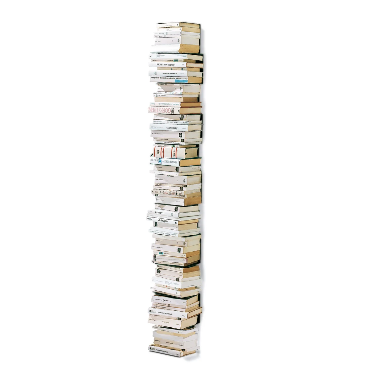 La bibliothèque murale Ptolomeo par Opinion Ciatti permet un rangement pratique pour les livres sur des surfaces murales étroites où des bibliothèques standards seraient trop volumineuses.