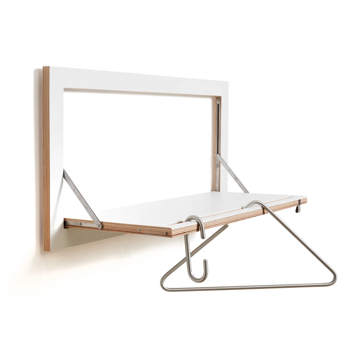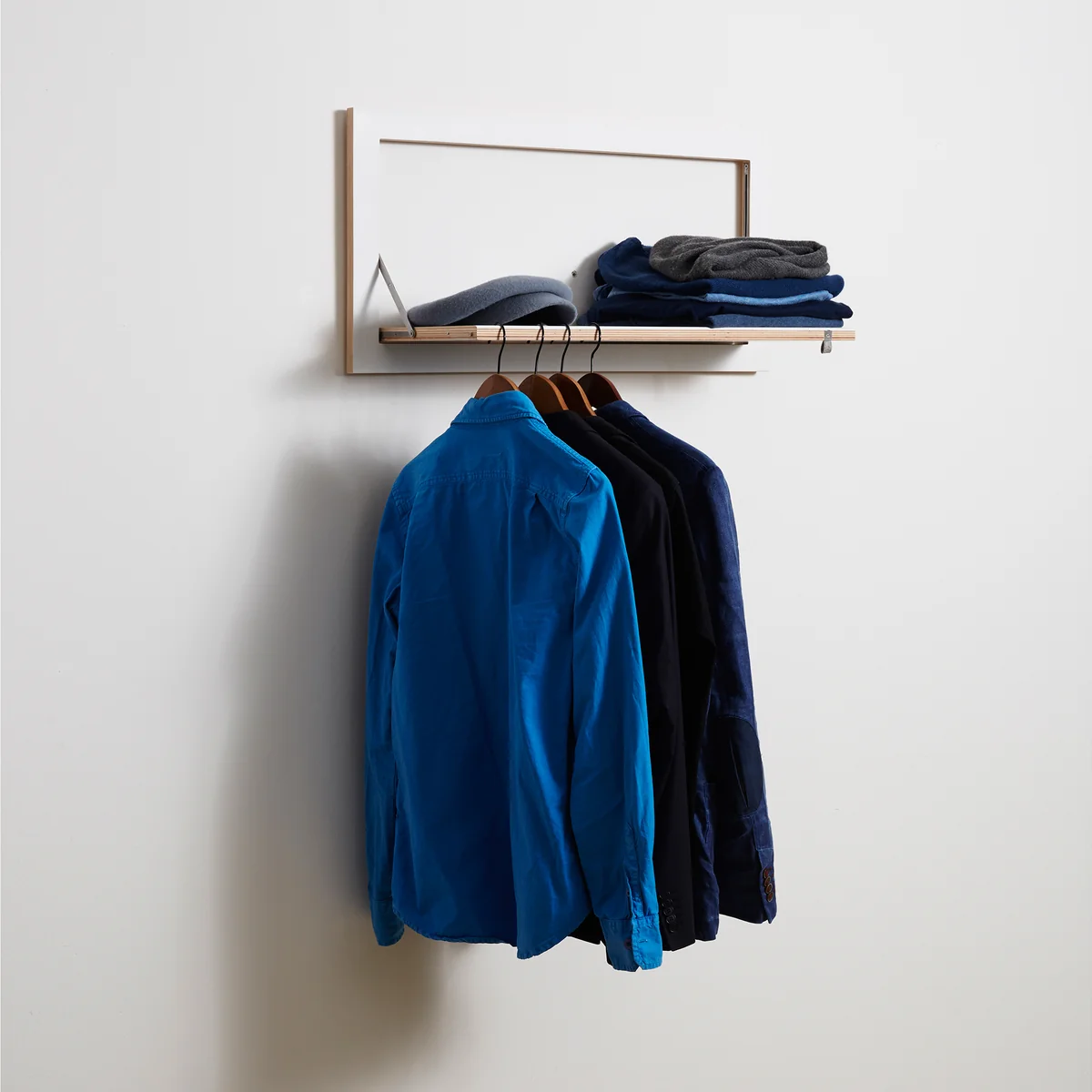 La tringle à vêtements est fabriquée en bois de bouleau multiplex. Elle est ensuite vernie à la main et est ainsi disponible en différentes couleurs. Les charnières pour le rabattement sont en acier inoxydable et une petite boucle en feutre facilite le rabattement.