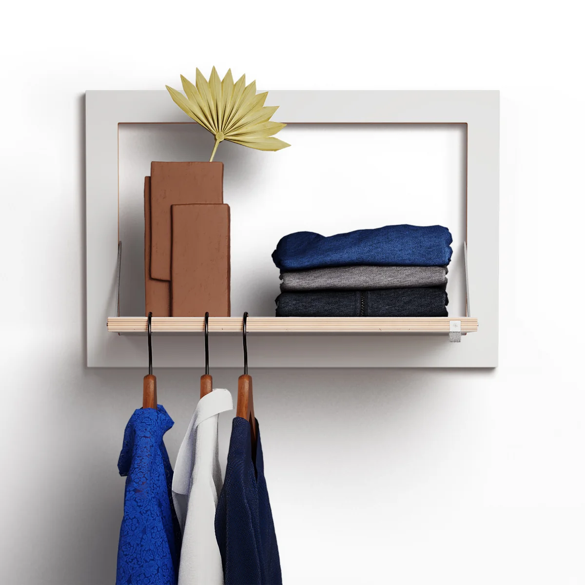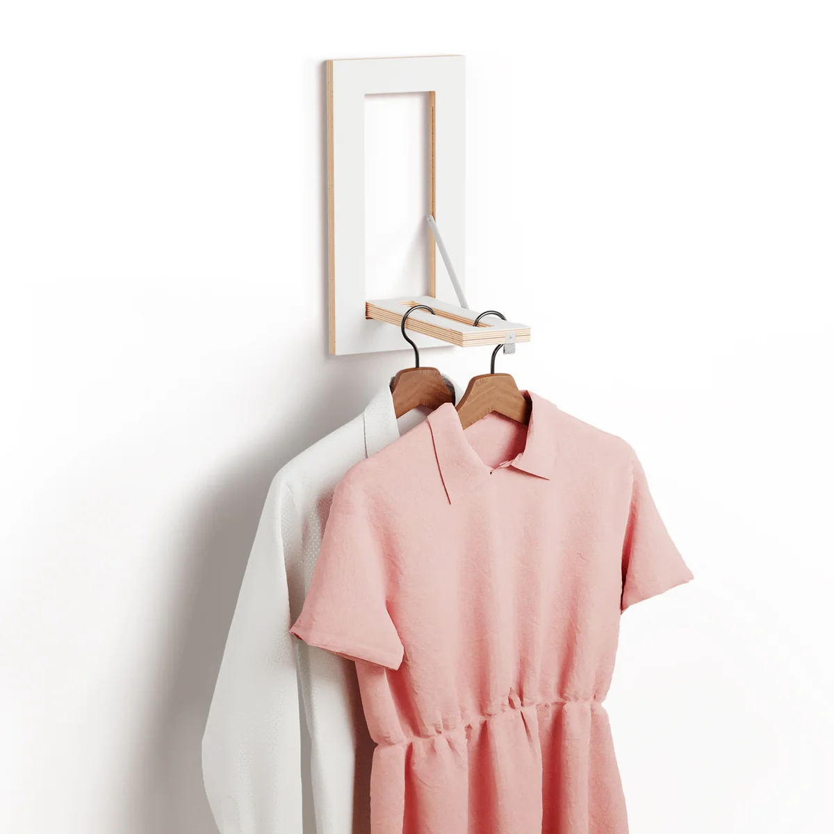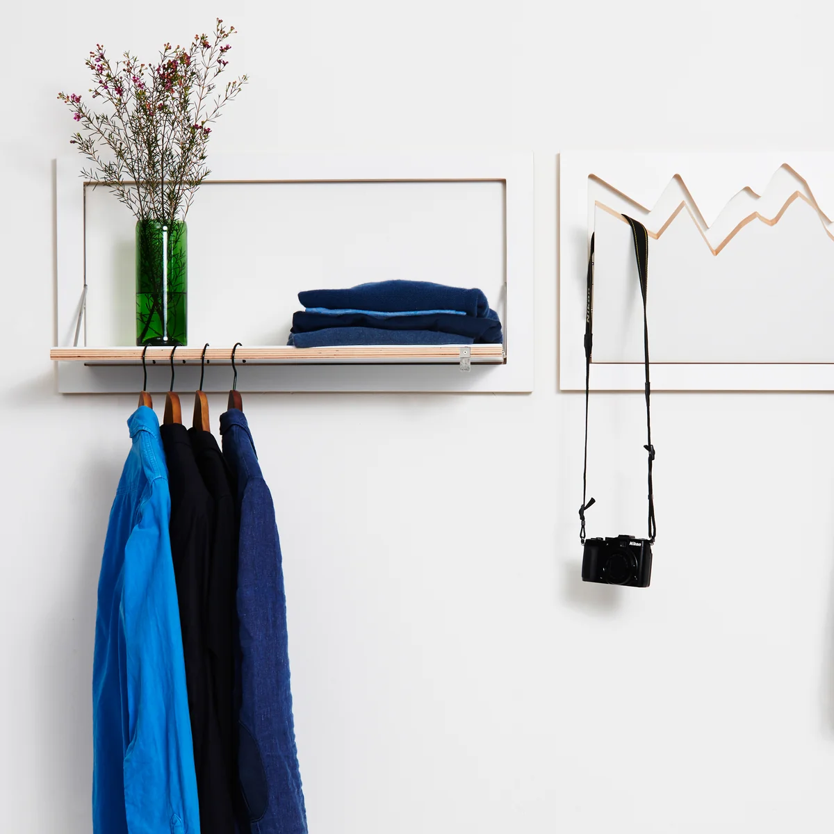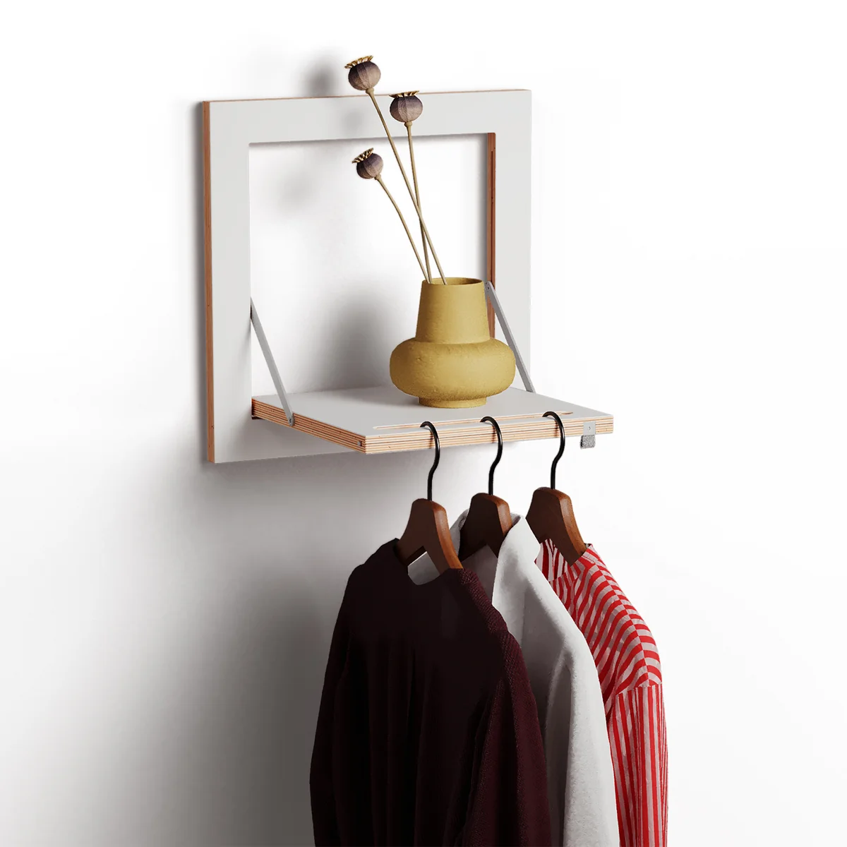 La tringle à vêtements Fläpps de Ambivalenz apparaît au premier coup d'œil comme une étagère murale ordinaire de Ambivalenz et ce n'est qu'au deuxième coup d'œil, lorsque le portemanteau est déplié, qu'on le reconnaît comme une tringle à vêtements avec rangement supplémentaire. Une fois repliée, seule une petite fente indique sa fonction supplémentaire. Le portemanteau peut accueillir manteaux, vestes, sacs, écharpes et bien d'autres choses encore grâce à des crochets et des cintres. La tablette est prévue pour les clés, les lunettes de lecture et le porte-monnaie.
