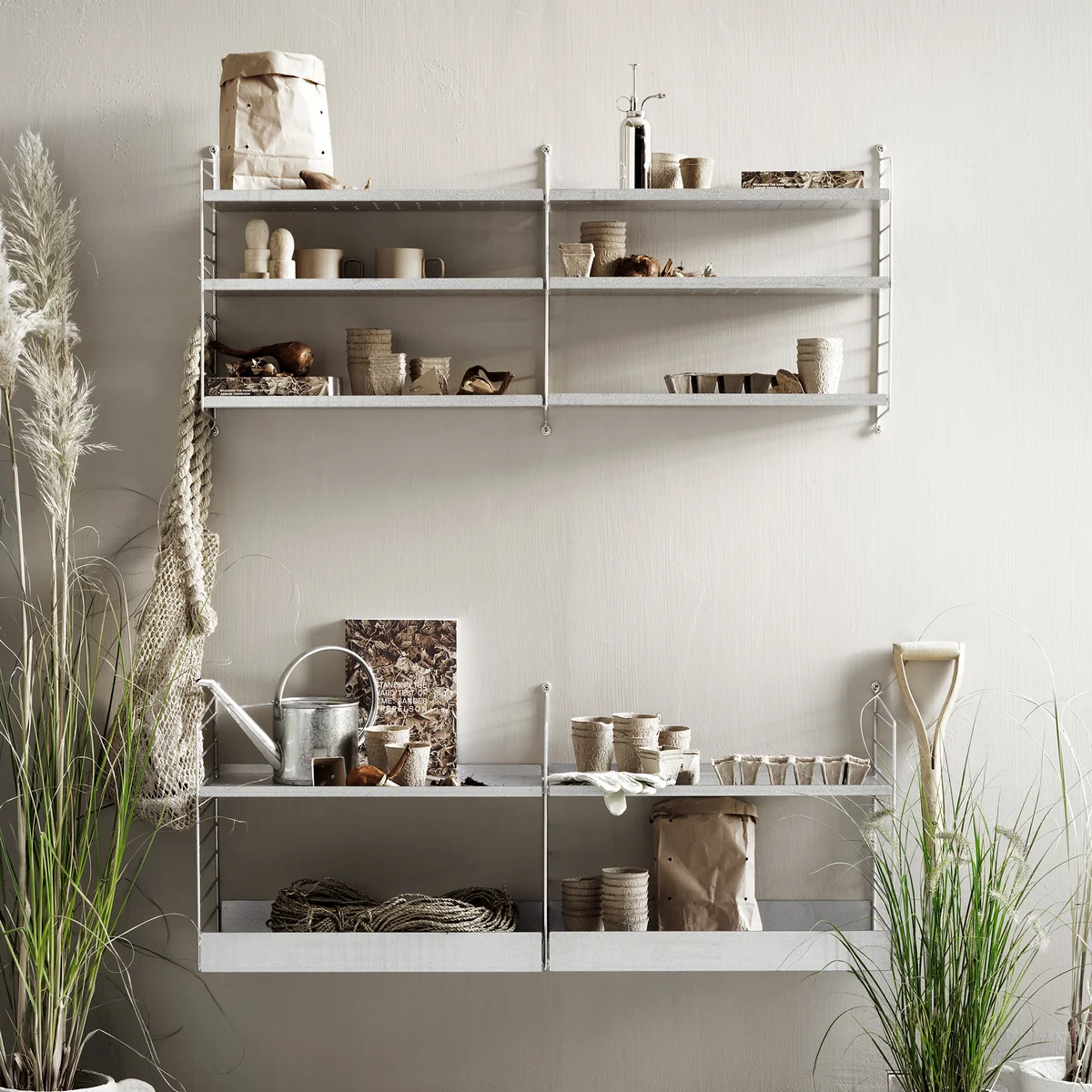 La gamme Outdoor La série se compose d'échelles murales, d'échelles de sol et de tablettes métalliques de différentes tailles et largeurs. Toutes sont fabriquées en acier galvanisé. Le métal galvanisé résiste à toutes les intempéries et confère au système String un aspect robuste.