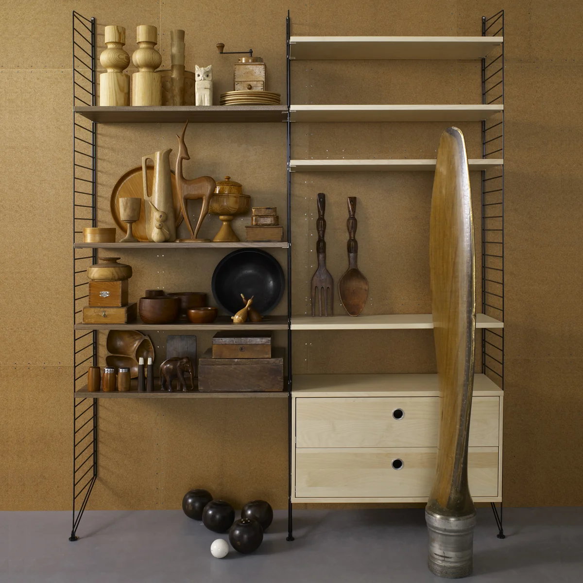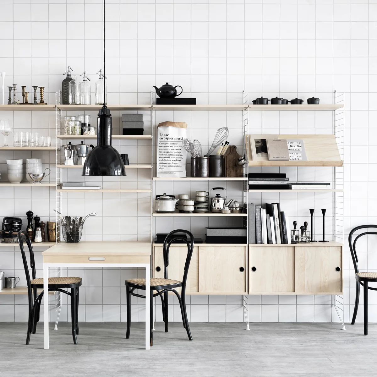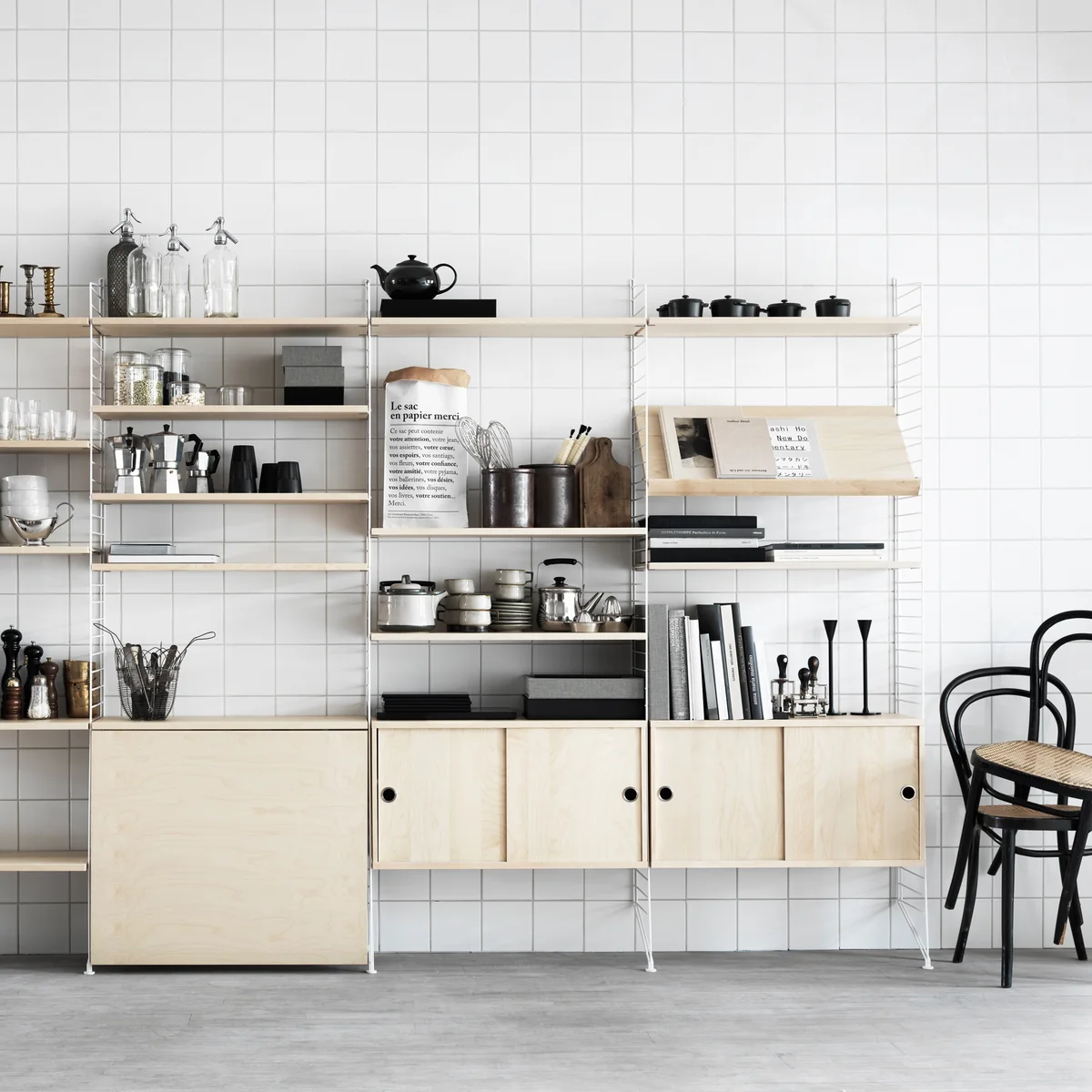 Le système d'étagères String en bouleau se laisse moduler et agrandir, selon vos besoins et vos envies. Tout ici trouve sa place, des livres à la chaîne Hi-Fi ou l'ordinateur.