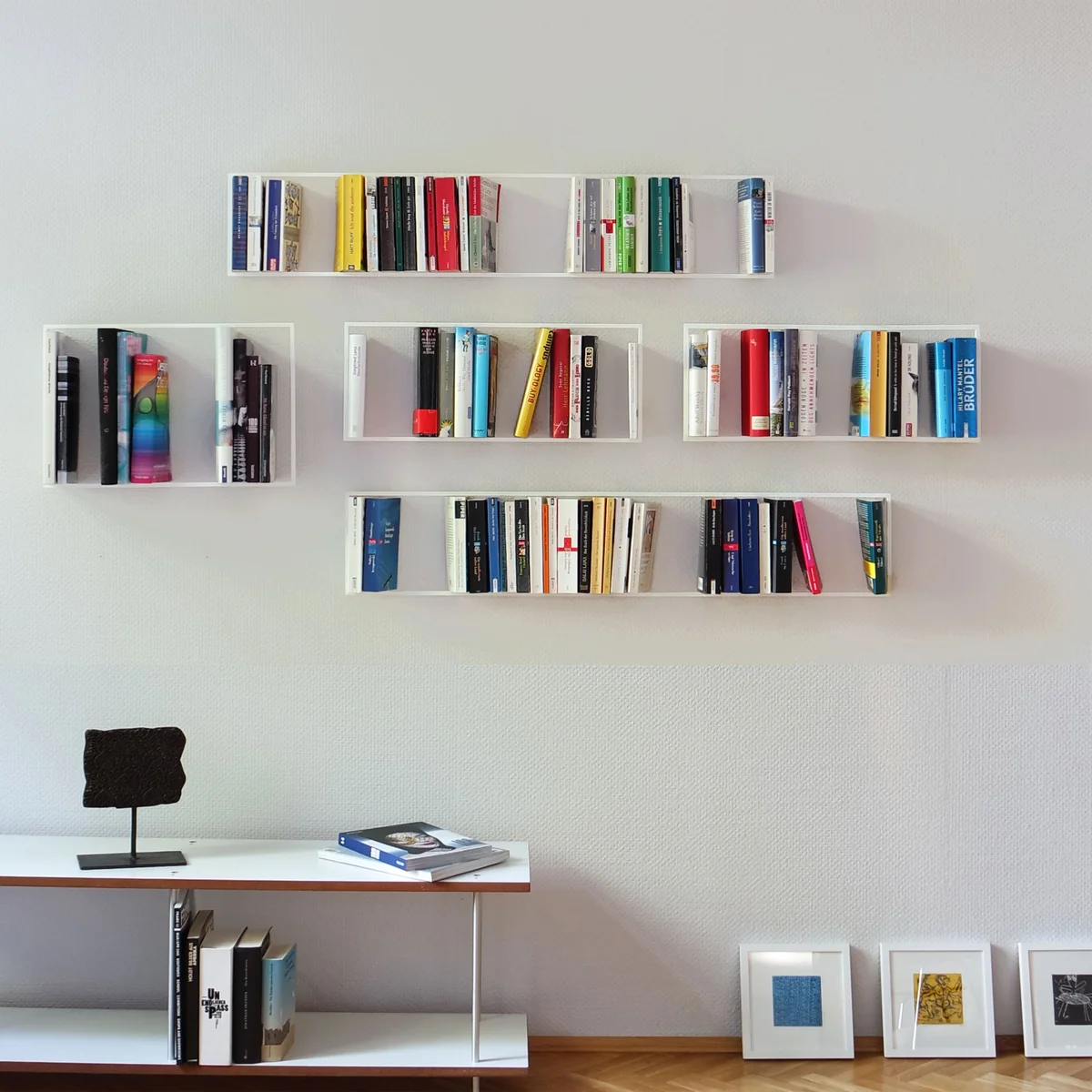 Étant donné qu'il existe différents formats de livres, le fabricant vonbox a conçu trois cadres différents selon le design de Trapp-Nosek Dietermann dans les tailles les plus classiques : livres de poches, livres plus grands et livres illustrés trouvent leur place sur les étagères-cadres. De par la disposition des étagères aux différents formats et profondeurs se forme une sorte de peinture murale vivante, tridimensionnelle, intégrant les livres comme des œuvres d'art dans la décoration intérieure.