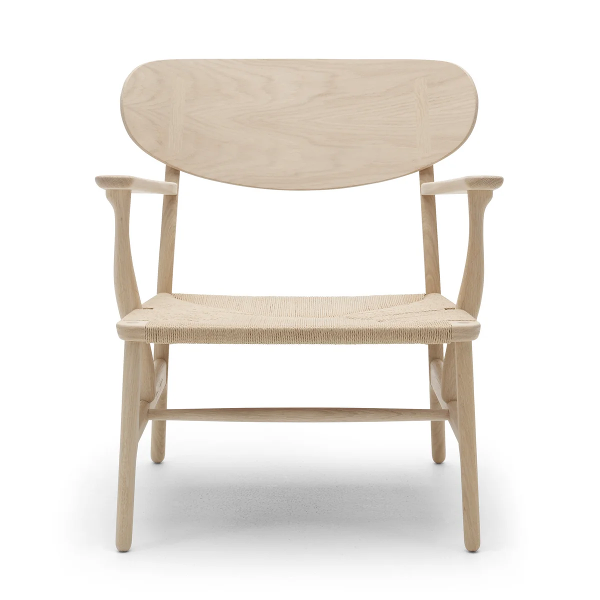 Les détails sensuels réalisés à la main avec la plus grande finesse, tels que le cadre de l'assise assemblé au doigt, les éléments cunéiformes entre les pieds de la chaise, le dossier et les accoudoirs, ainsi que l'assise tressée en fil de papier, témoignent d'une sensibilité unique et d'un artisanat de grande qualité, qui s'associent dans le design du CH22 s'unissent.