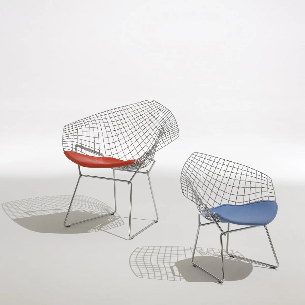 Knoll propose la chaise Diamond dans plusieurs versions : avec ou sans coussin, capitonnée entièrement, avec un cadre chromé ou chromé satiné ainsi qu’avec un cadre avec un revêtement Rilsan comme modèle outdoor. En outre, le fauteuil Diamond est disponible en version grande et version plus petite pour les enfants.