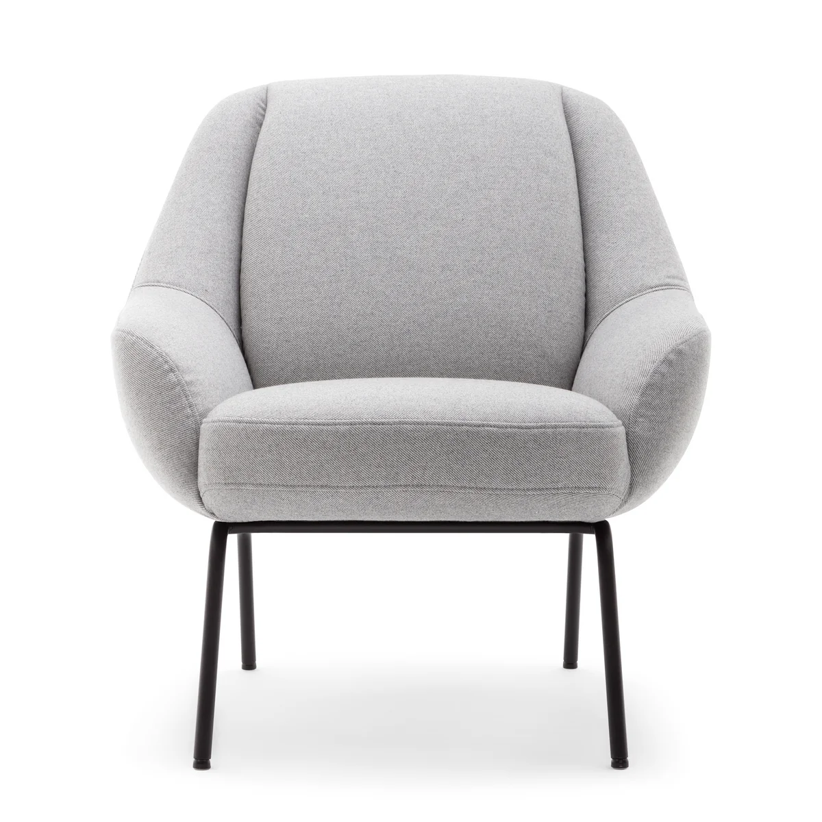 Le fauteuil d'une hauteur d'assise de 44 cm se compose d'une structure en tube d'acier rond à quatre pieds, revêtue de poudre. Sellerie souple avec accoudoirs pour plus de confort. Le rembourrage en différentes couleurs et matériaux rend le fauteuil personnalisable, ce qui le rend idéal pour toutes les ambiances.