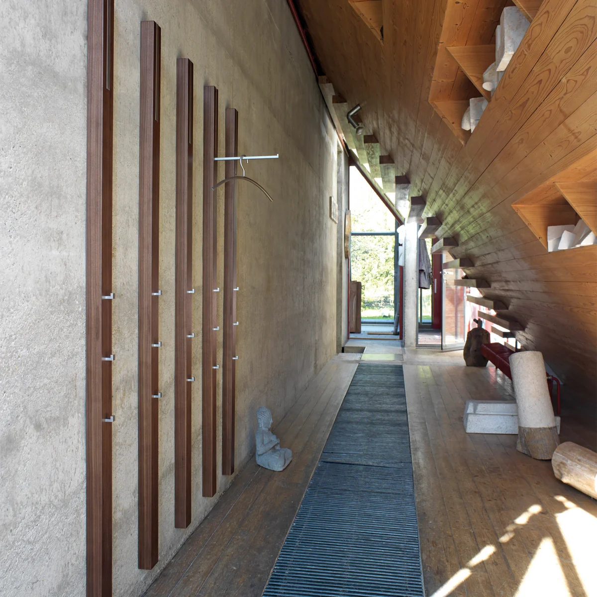 À l'extrémité, Line possède un crochet rabattable qui dépasse de 26,5 centimètres du portemanteau. Mais Line est ici flexible : l'angle d'inclinaison peut être réglé depuis l'arrière à l'aide d'une vis de réglage. Ainsi, le portemanteau peut recevoir directement des vestes, mais aussi (si le crochet rabattable est perpendiculaire au portemanteau) être accroché à des patères et recevoir ainsi indirectement encore plus de capacités. Que ce soit en solo ou en groupe côte à côte, Line range ses vêtements avec style et en toute sécurité.