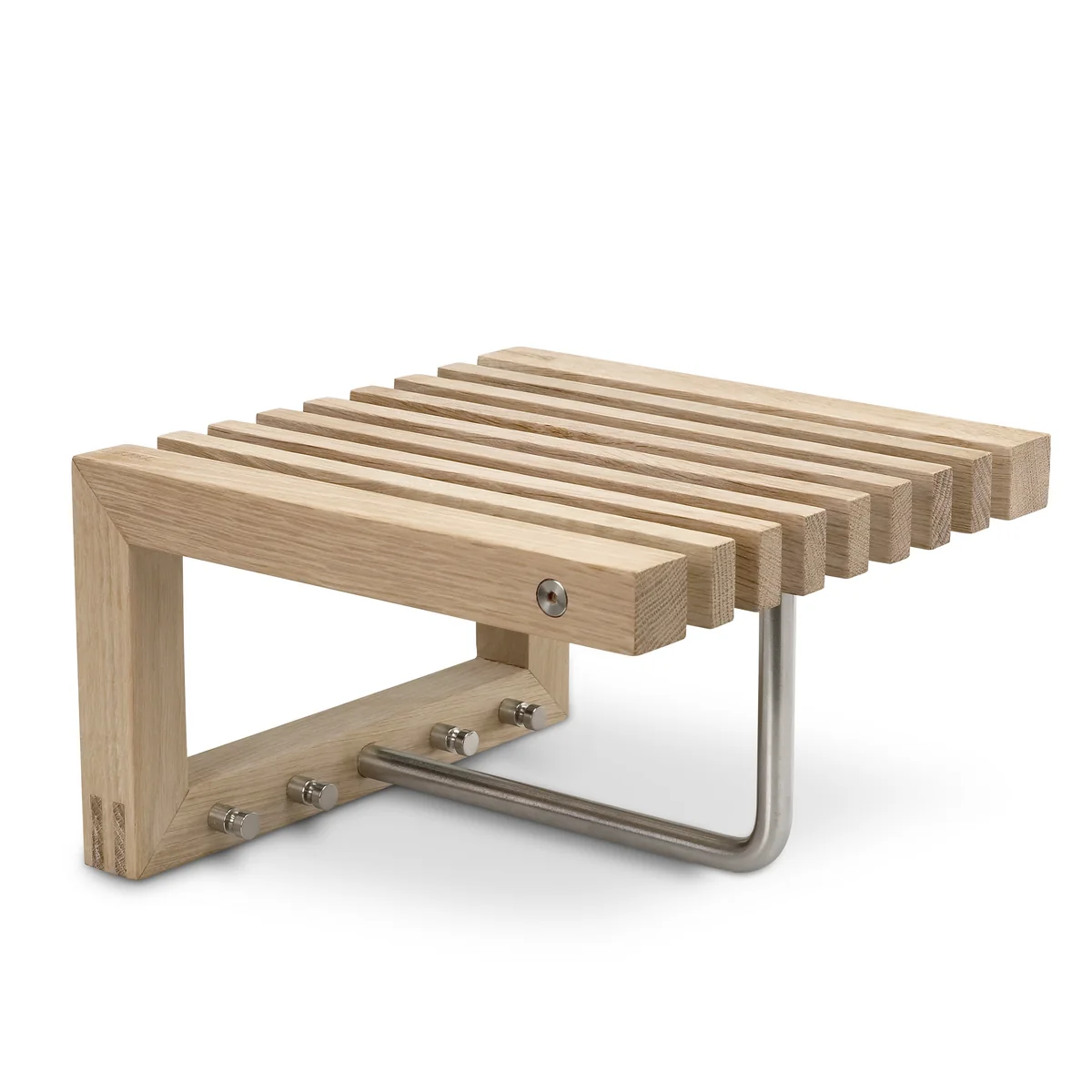 La simplicité décorative de la série Cutter -Mais la série s'est également révélée idéale pour le hall, la salle de bains et la cuisine - en fait, pour toutes les pièces de la maison. C'est pourquoi elle a été complétée par des produits d'intérieur classiques. Le Cutter Le mini-portemanteau est au choix en teck ou en chêne. La barre de la Cutter La barre du portemanteau est en acier inoxydable, ce qui ajoute un contraste moderne à l'aspect classique du bois.