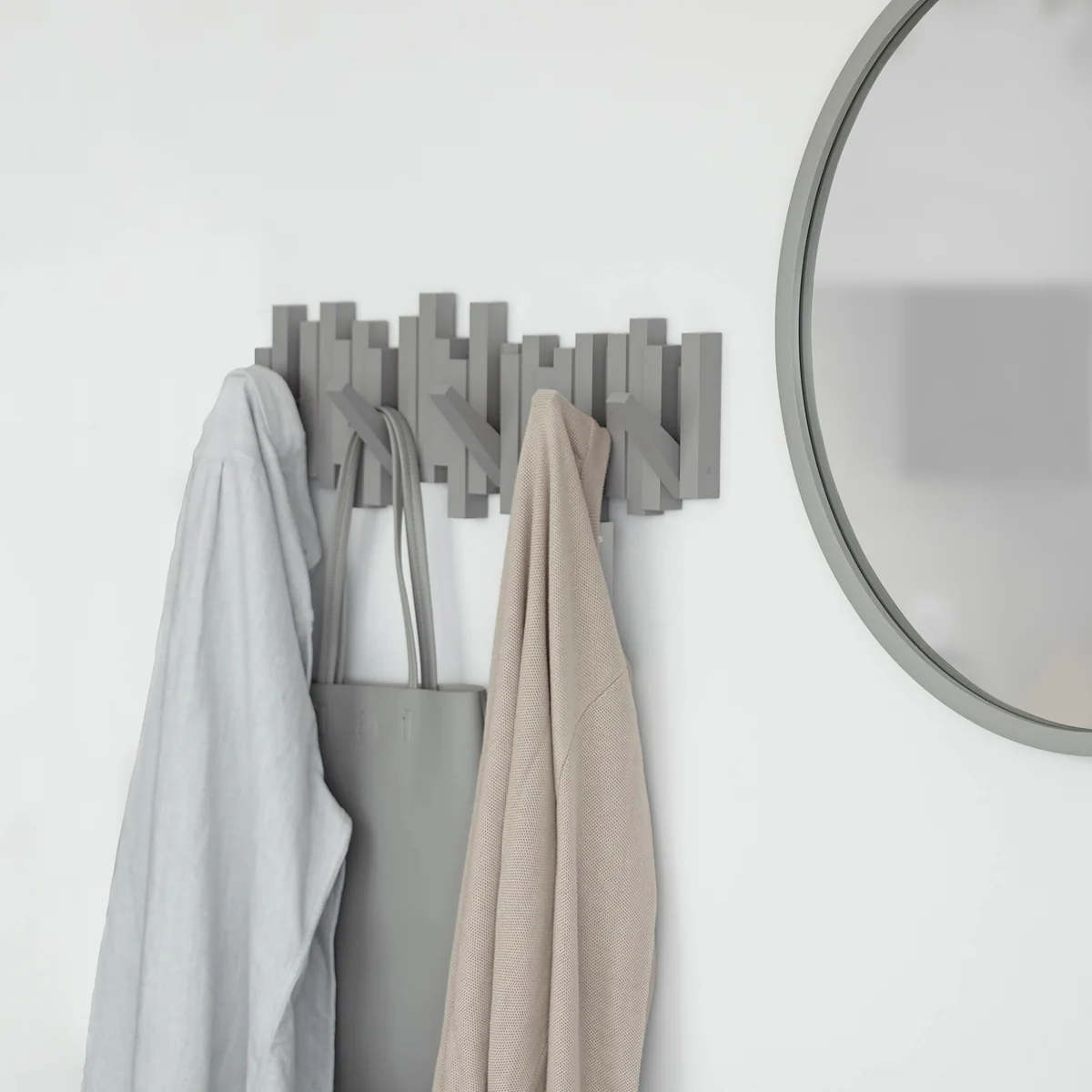 Multi Hook de Umbra est un porte-manteau mural qui ne se révèle qu'au deuxième coup d'œil. La forme sculpturale du rail à crochets conçu par David Quan fait davantage penser à un objet d'art qu'à un porte-manteau mural.