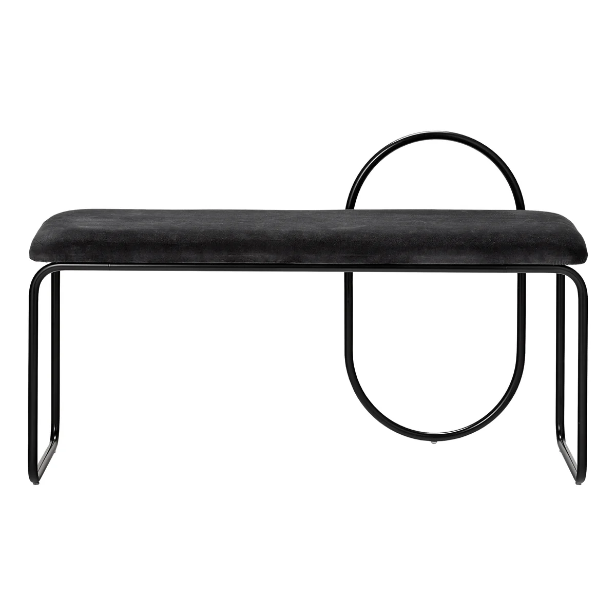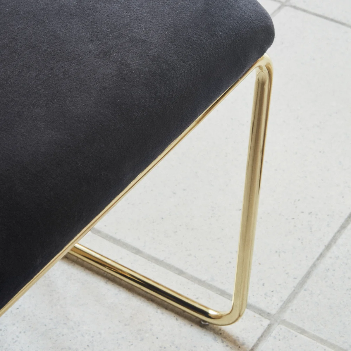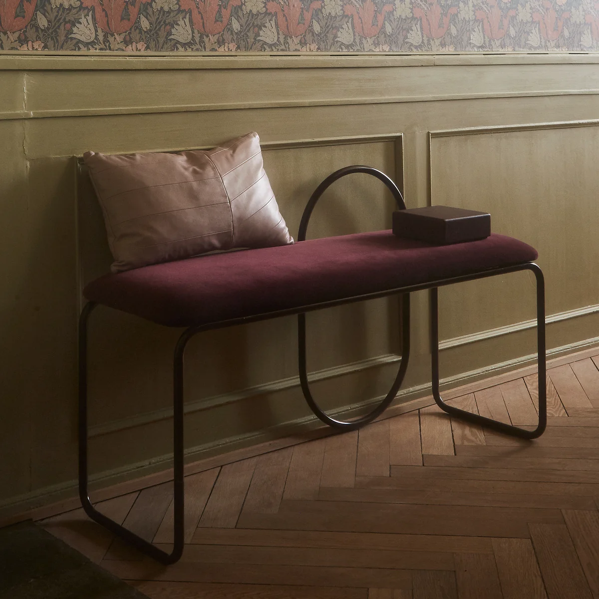 L'assise rembourrée du banc est recouverte de velours de coton, ce qui lui confère une note particulièrement élégante. Le piètement est quant à lui en fer et apporte une touche de charme industriel. La combinaison des deux matériaux donne naissance à un meuble intemporel qui peut être utilisé de différentes manières. Dans l'entrée, le banc Angui sert par exemple de lieu d'arrivée, dans le salon, il s'intègre dans un groupe de sièges existant et dans la chambre à coucher, il sert d'alternative au serviteur muet classique.