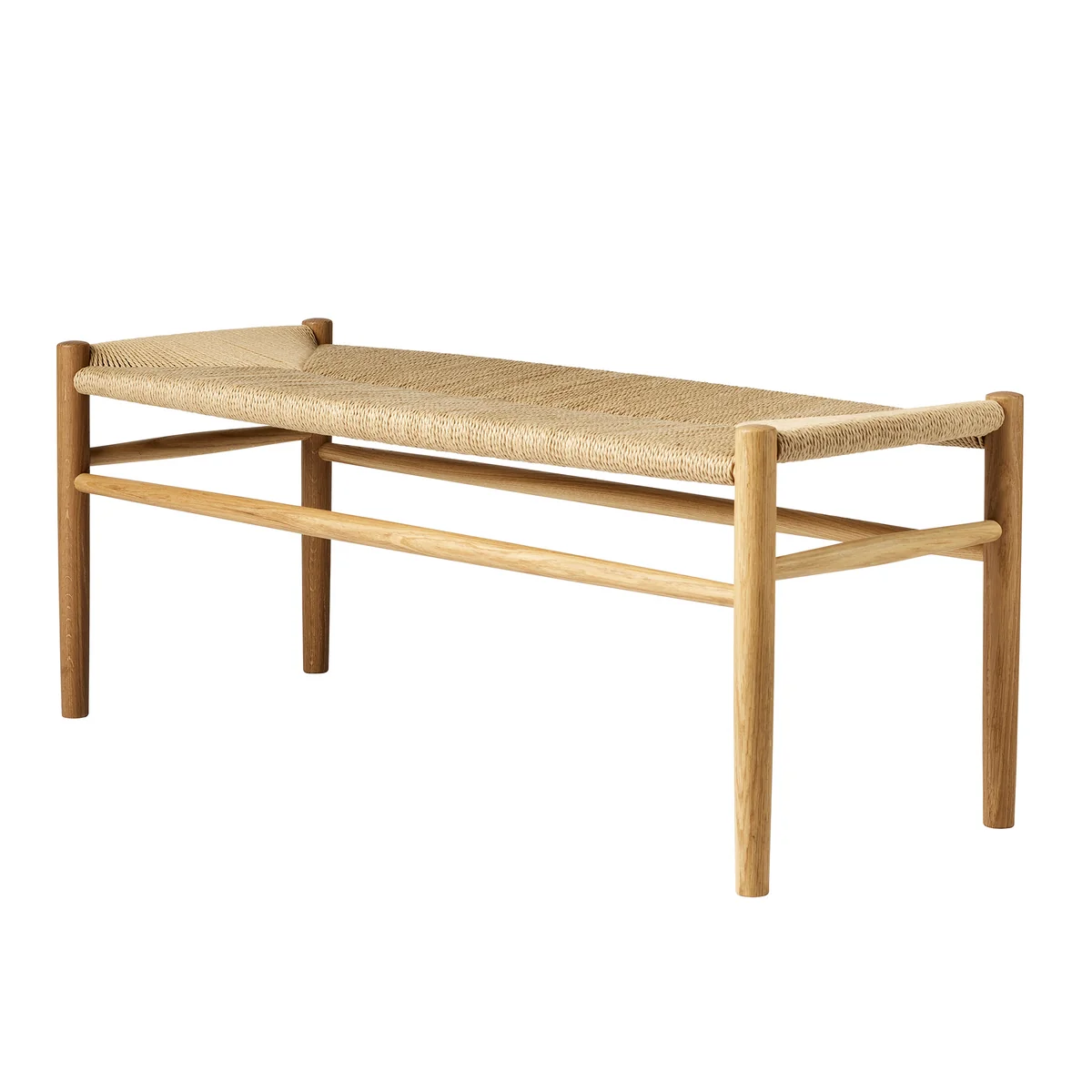 Le banc J83B est fabriqué en bois de chêne massif certifié FSC® et provient de forêts européennes. Le siège est constitué d'un cannage naturel et ajoute de la convivialité au design.