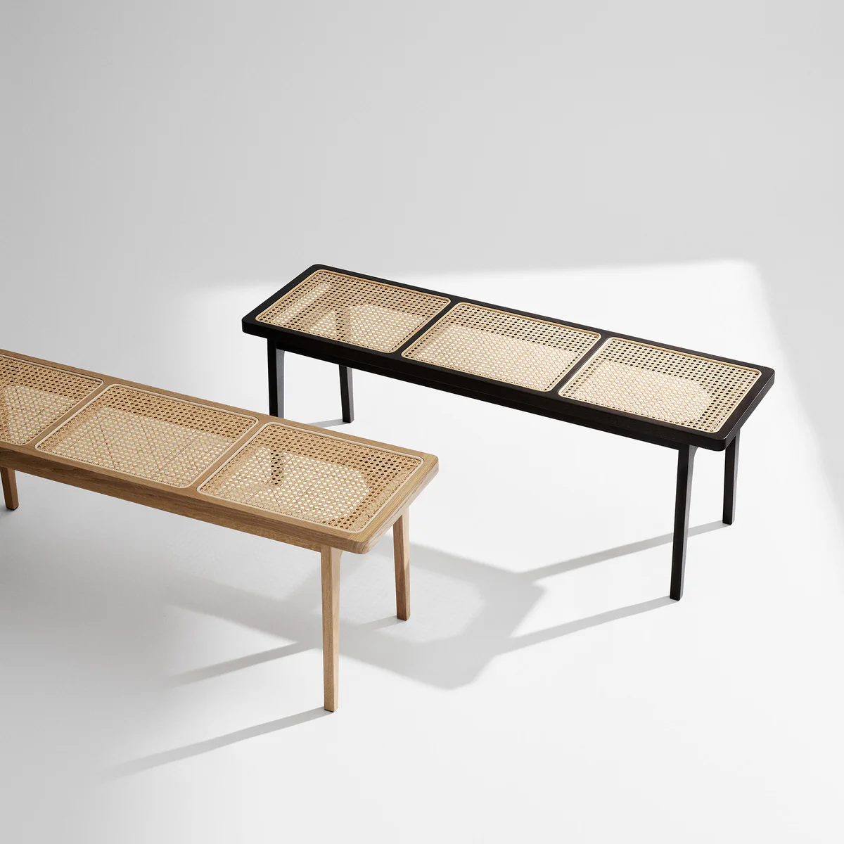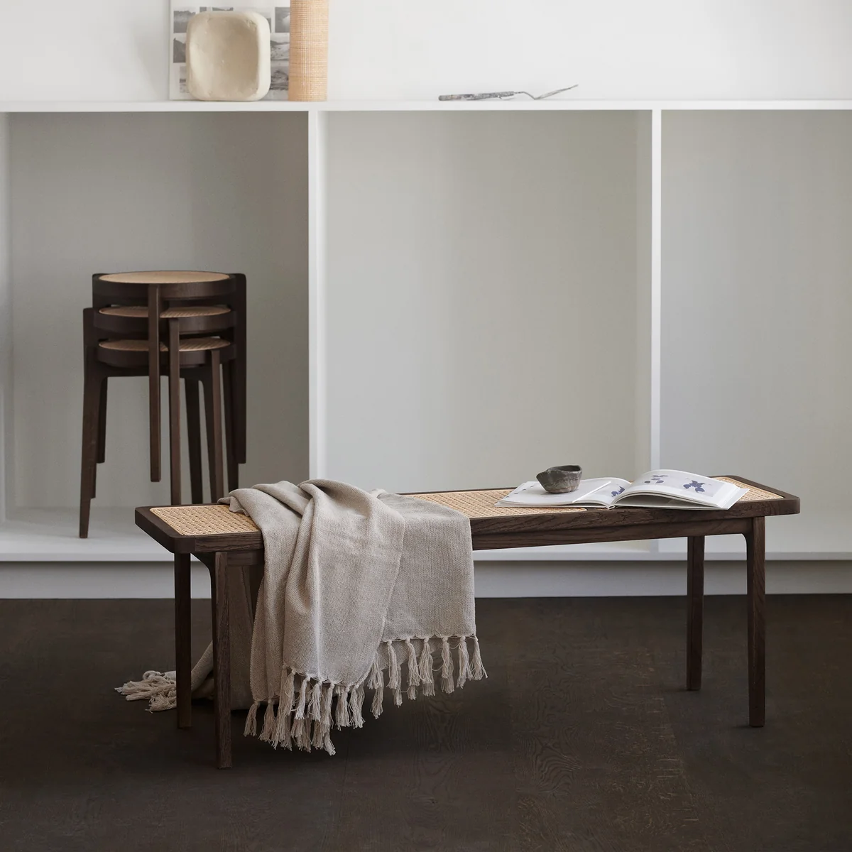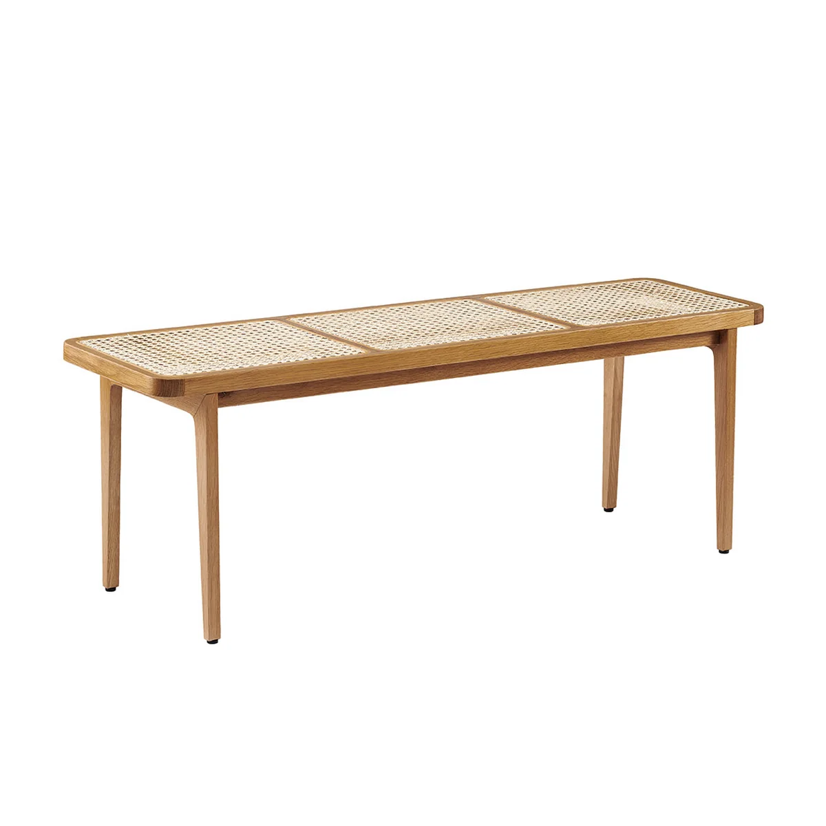 Le banc est composé d'une structure en bois massif. Le tressage en rotin est inséré dans le cadre selon un procédé traditionnel. Le tressage se fond joliment dans son environnement et souligne la simplicité de la construction du banc. Le banc peut être placé comme décoration dans la pièce et constitue également un siège pratique dans l'entrée, à la table à manger ou dans la chambre à coucher.