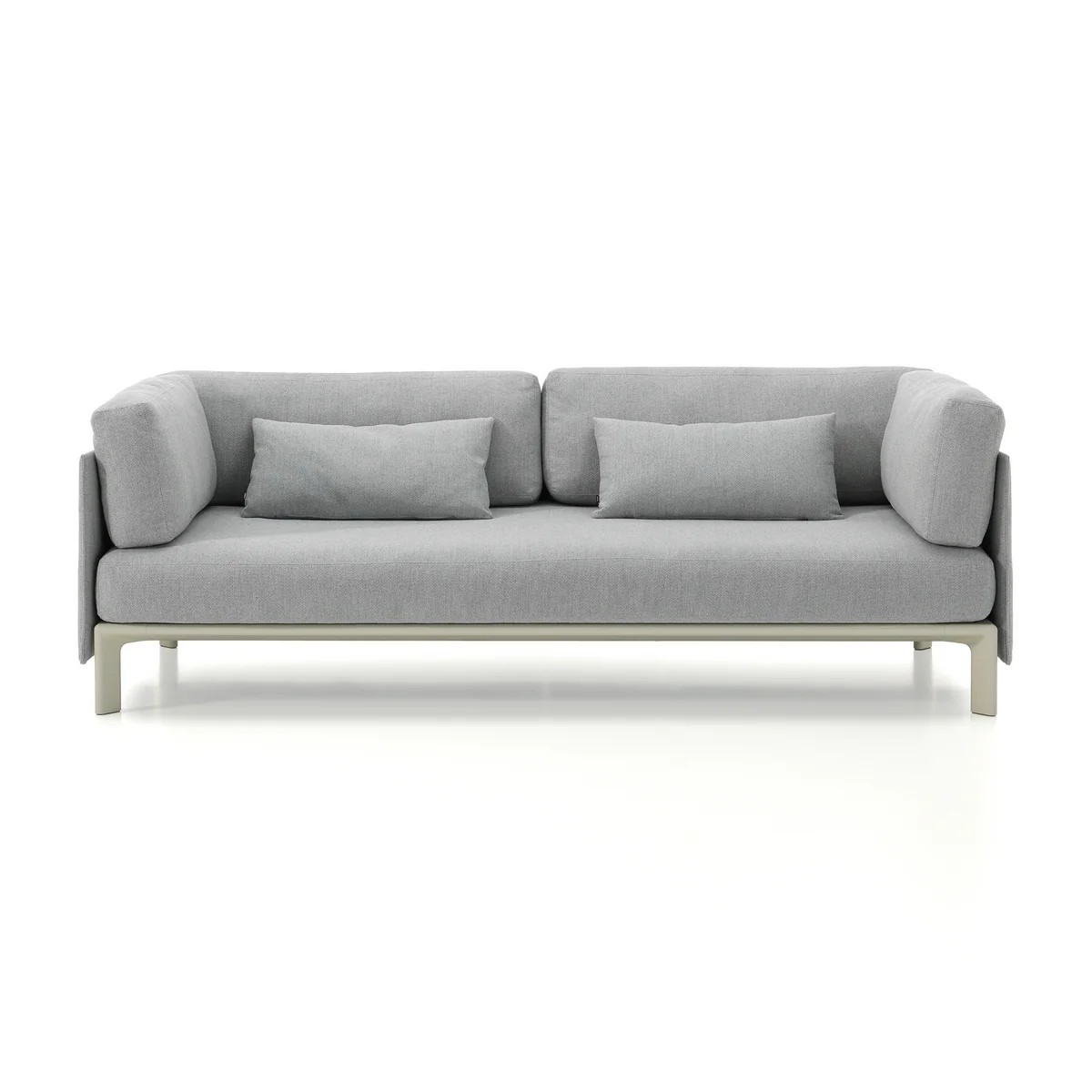 Les coussins, entièrement fabriqués à partir de fibres PET recyclées et sans rembourrage animal, offrent un confort particulier. Les housses en tissu sont amovibles, ce qui facilite le nettoyage et le remplacement. Le cadre du canapé est en aluminium robuste contenant 80 % de matières recyclées et tous les éléments sont conçus pour être facilement séparés et recyclés à la fin de leur cycle de vie - rien n'est collé ou contrecollé.