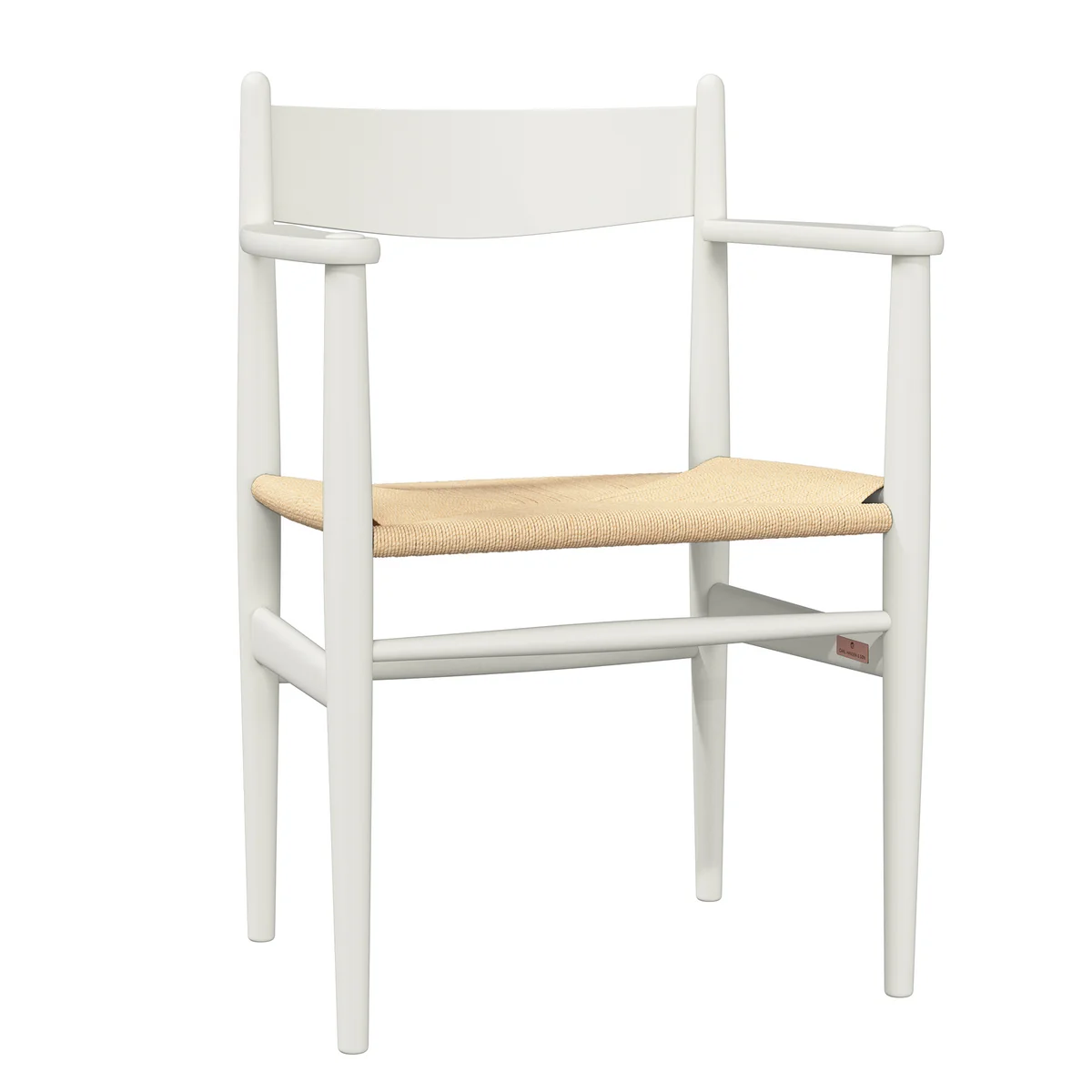 L'apparence légère et élégante de la chaise est créée par les pieds ronds verticaux en chêne et un dossier courbé vers l'arrière pour garantir le meilleur soutien possible du dos. L'assise en cannage naturel tissée à la main et les accoudoirs légèrement arrondis et plats assurent confort et stabilité.