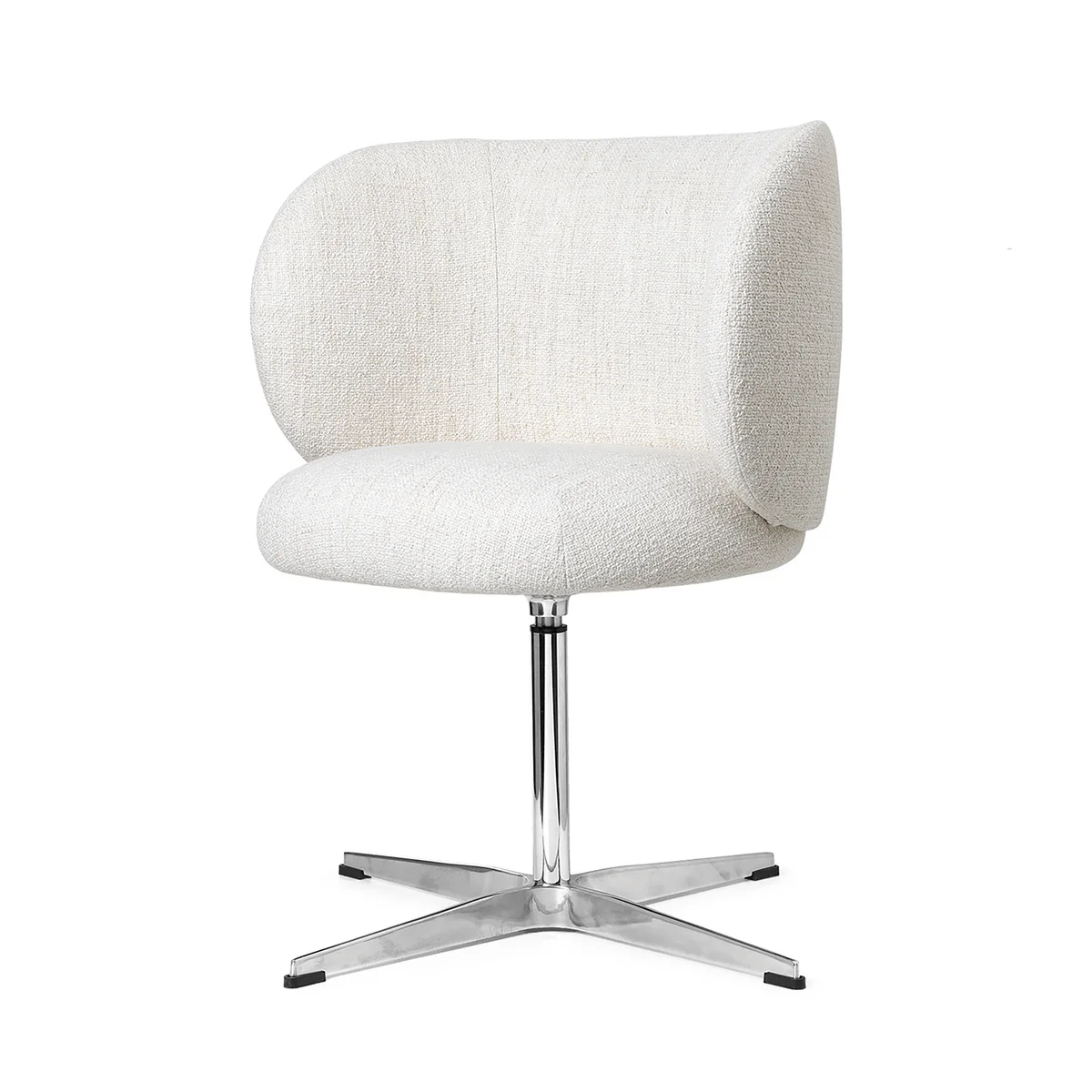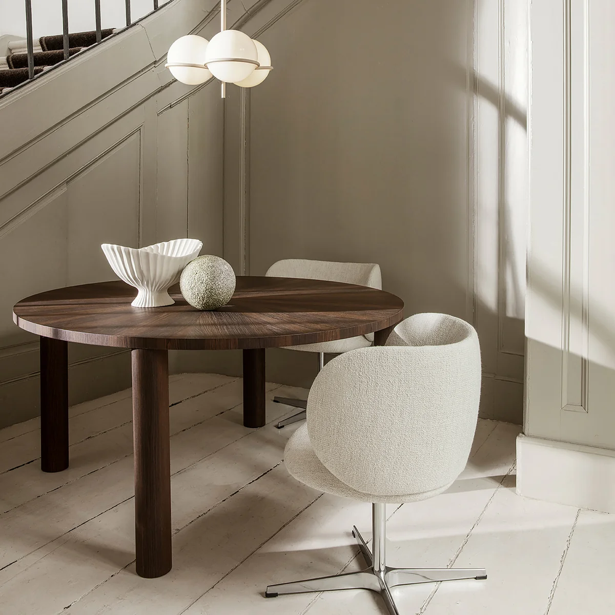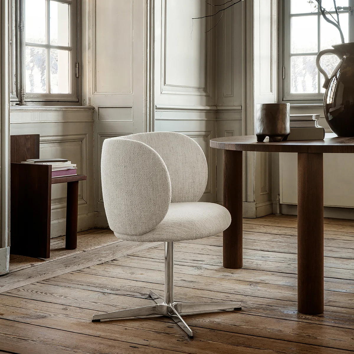 La chaise Rico Dining Chair (pivotante) de la maison Ferm Living séduit par ses superbes courbes et son volume voluptueux. Les lignes douces de la chaise lui confèrent une expression conviviale et enveloppante. Le piètement rotatif fonctionnel en aluminium offre la base robuste et pivotante de la chaise, tandis que l'assise en mousse moulée est recouverte de bouclé (35% acrylique, 24% polyester, 19% viscose, 14% coton, 5% lin et 3% autres fibres) ou de Hallingdal de Kvadrat (70% laine vierge et 30% viscose). Rico peut être merveilleusement placé à la table de la salle à manger ou utilisé comme chaise de bureau élégante dans le bureau.