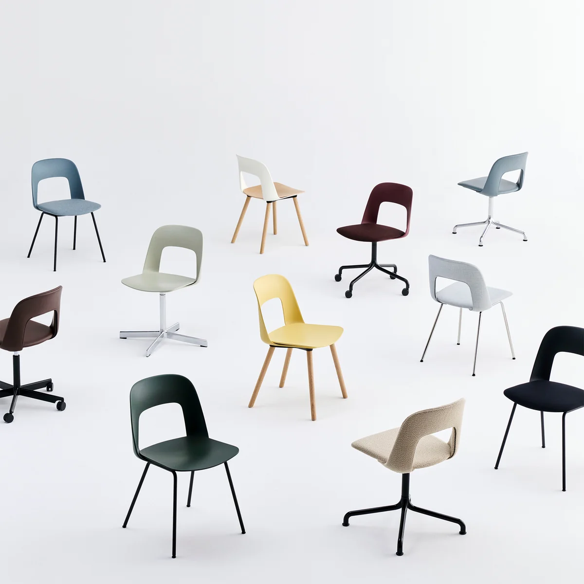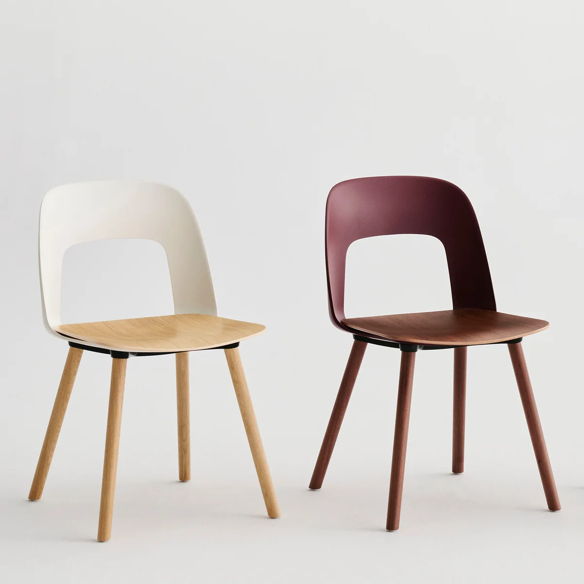 La variante 122 avec pieds en bois arrondis apporte une touche supplémentaire de chaleur et d'intemporalité au design tout en garantissant une grande stabilité. Le dossier est composé d'au moins 96 % de plastique recyclé post-consommation et est disponible en différentes couleurs.