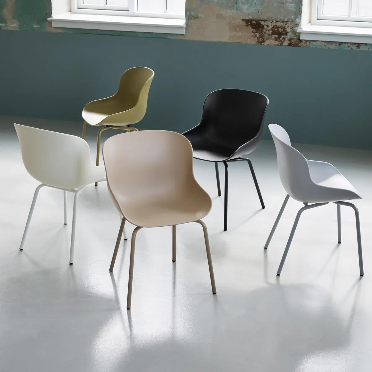 La chaise se compose d'un cadre à quatre pieds en acier peint par poudrage et d'une coque d'assise en polypropylène. Les deux parties sont peintes de la même couleur, ce qui donne à la chaise un aspect particulièrement calme et uniforme. Cette chaise intemporelle est particulièrement adaptée à une table à manger ou à un bureau. Disponible en différentes couleurs, la chaise Hyg s'intègre bien dans différents environnements.